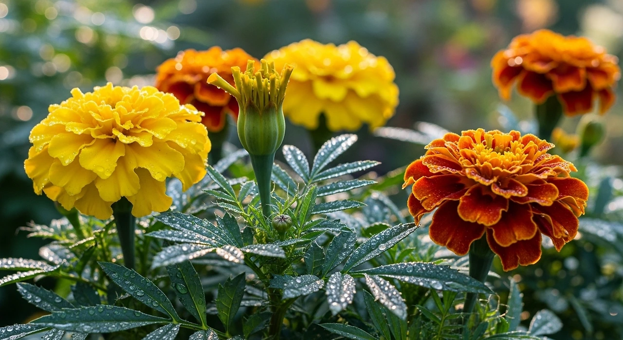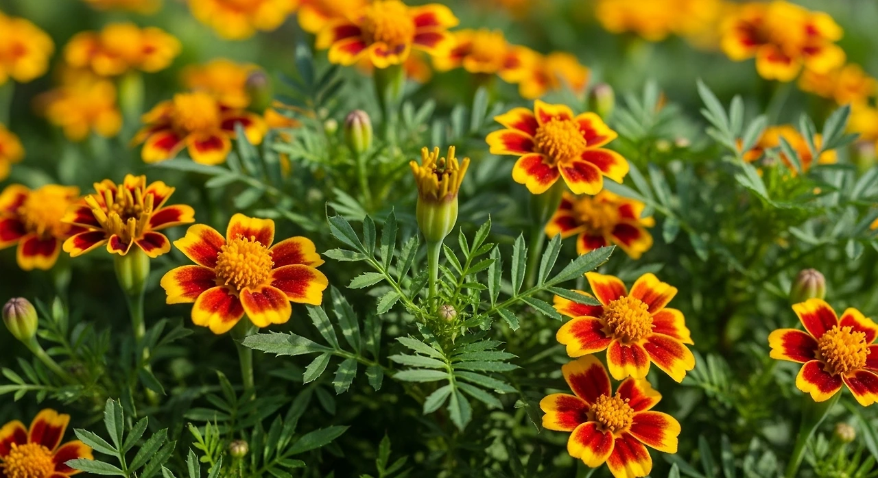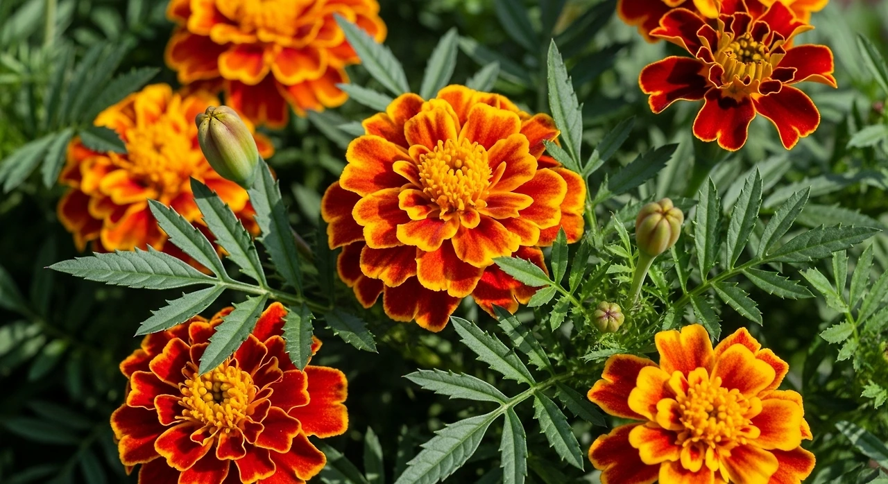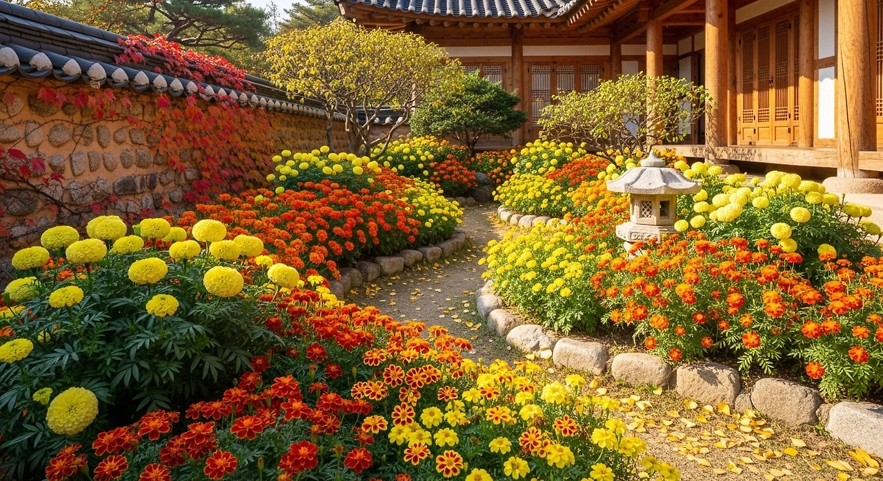 프렌치 메리골드는 붉은빛과 주황빛이 섞인 작은 불꽃 같은 꽃으로 화단을 수놓습니다.