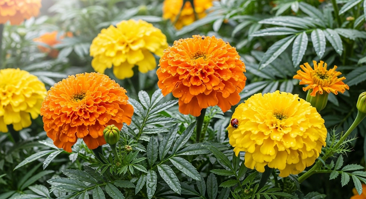 아프리칸 메리골드는 크고 둥글게 피어나는 황금빛 꽃으로 당당한 자태를 뽐냅니다.