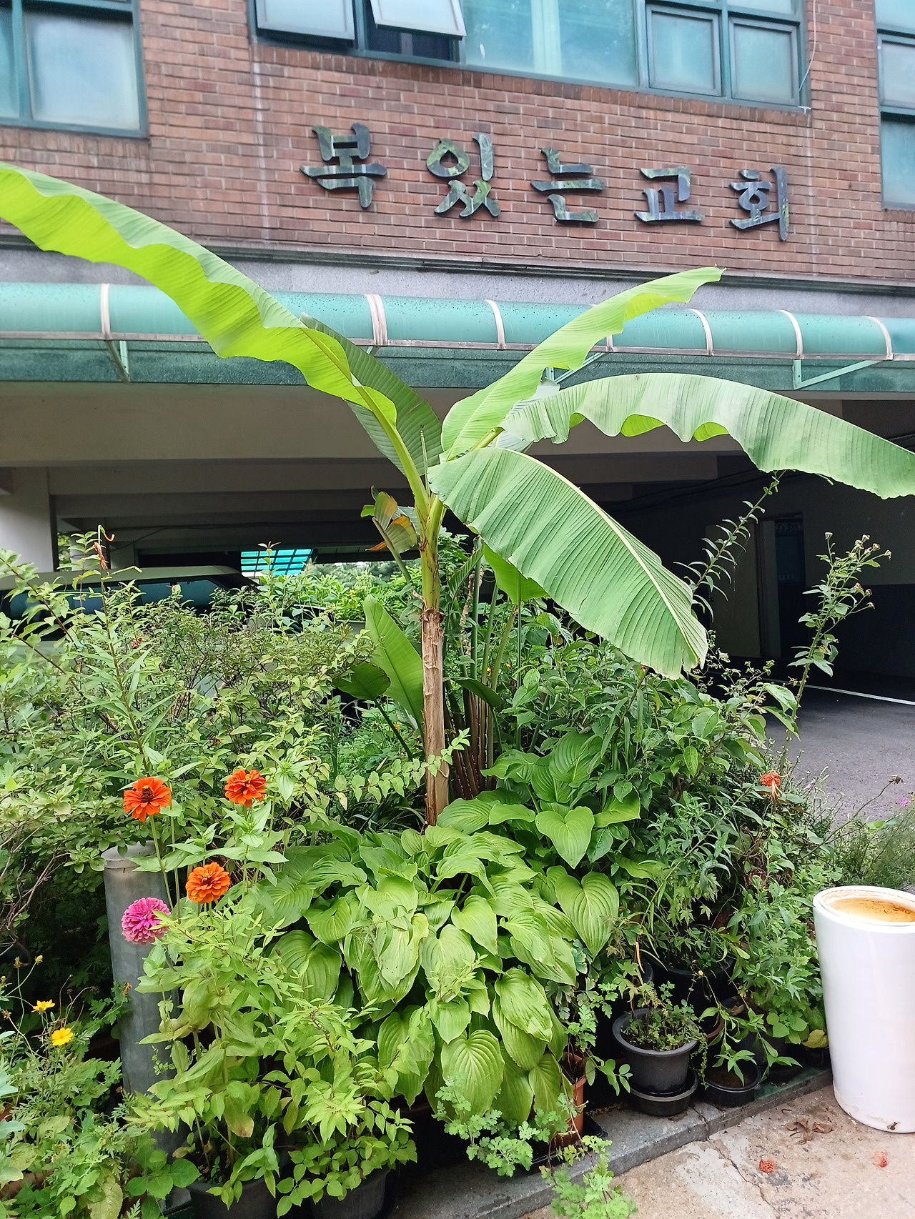 저는 매일 산책하는 길에 갈산공원 앞의 작은 교회를 지나갑니다. 이 교회는 참 특별해요. 보통 교회라면 정돈된 화단이 있기 마련인데, 이곳은 화단 대신 교회 곳곳에 놓인 화분들이 엄청난 식물 컬렉션을 자랑합니다.
