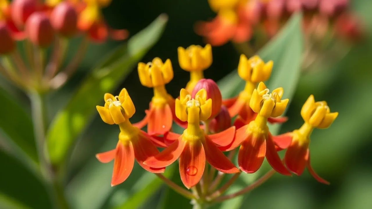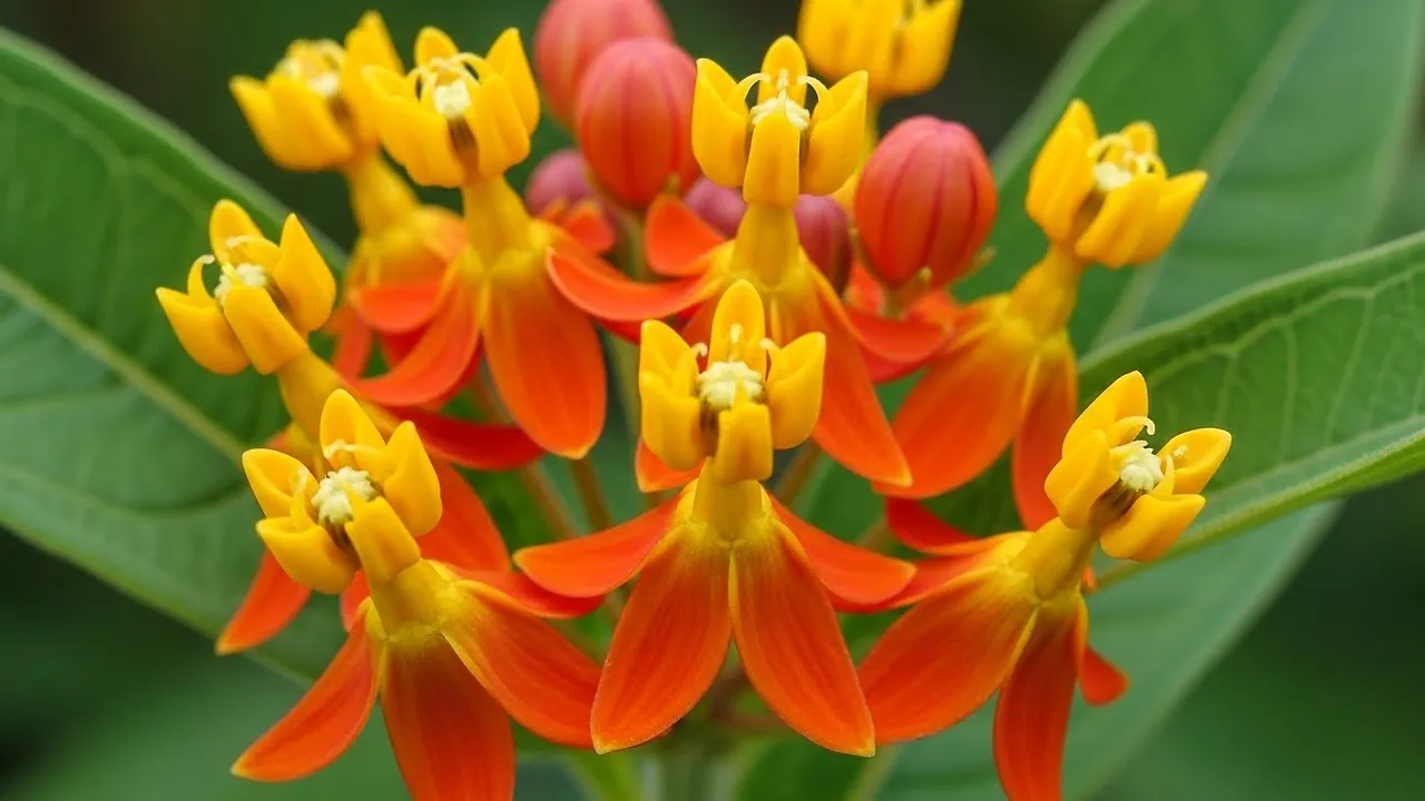 붉거나 주황빛 화관이 바깥으로 젖혀지고, 그 위에는 노란 부화관이 톡 솟아 있습니다. 마치 붉은 어깨 위에 금관(金冠)이 얹힌 임금처럼 보입니다. 속명 Asclepias는 그리스 신화 속 의술의 신 아스클레피오스의 이름에서 유래했으니, 왕관과 치유의 이미지가 한 꽃에 담긴 셈입니다.