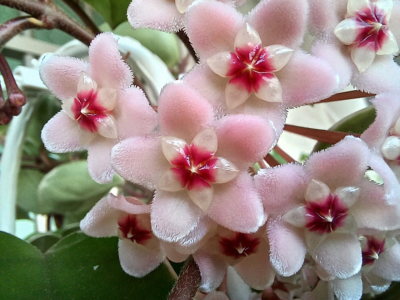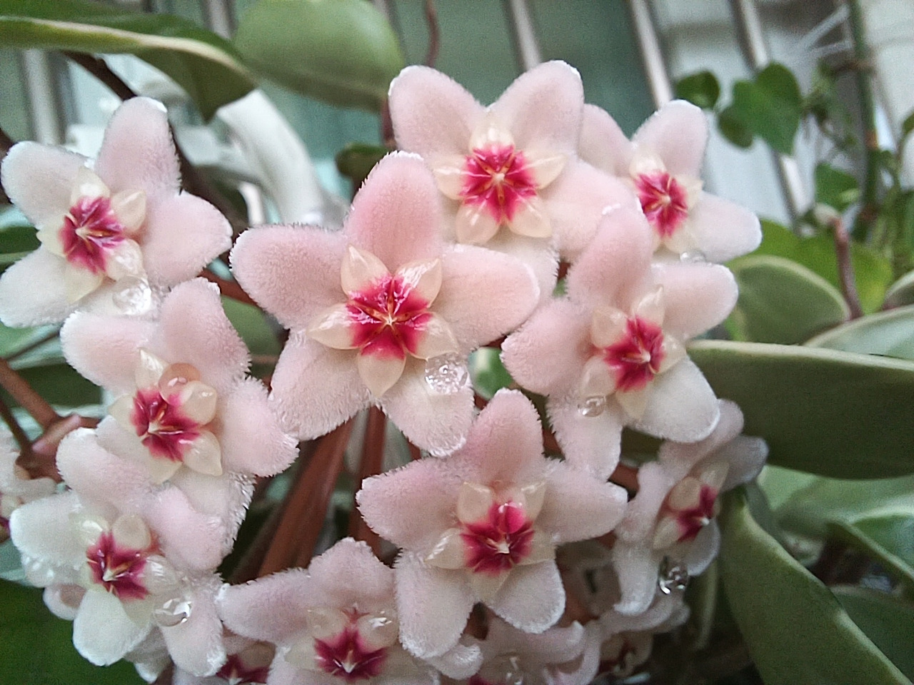 호야의 진짜 마법은 꽃이 필 때 시작됩니다. 이 달콤한 밀랍 꽃은 화려함보다는 정교함으로 우리의 마음을 사로잡습니다. 벨벳처럼 미세한 솜털로 뒤덮인 연한 분홍빛 별 모양의 꽃잎, 그리고 그 중앙에 루비처럼 박혀 있는 진홍색 코로나. 작은 꽃들이 둥근 공처럼 모여 피어난 모습은 마치 정교하게 세공된 보석 같기도 합니다.