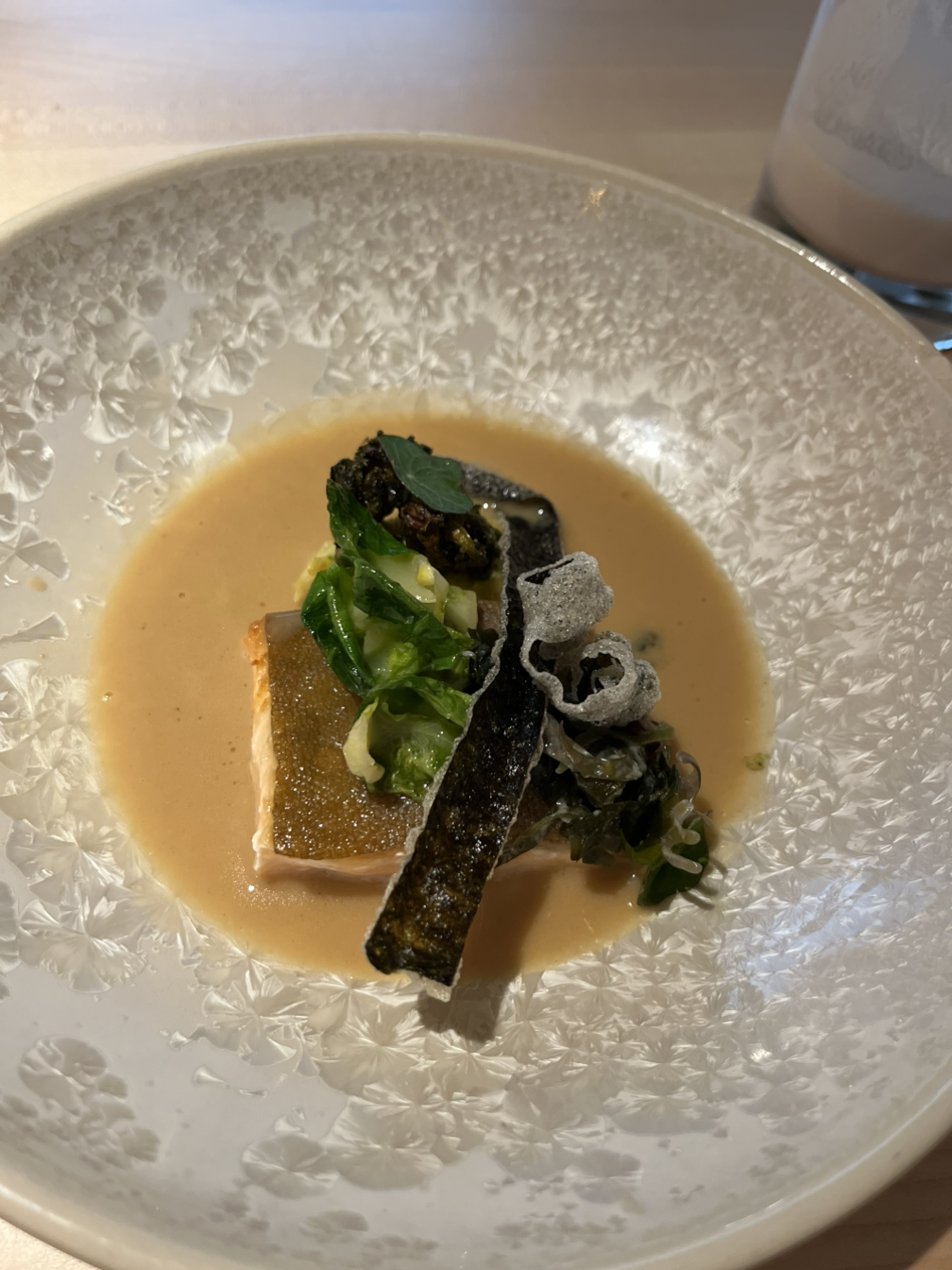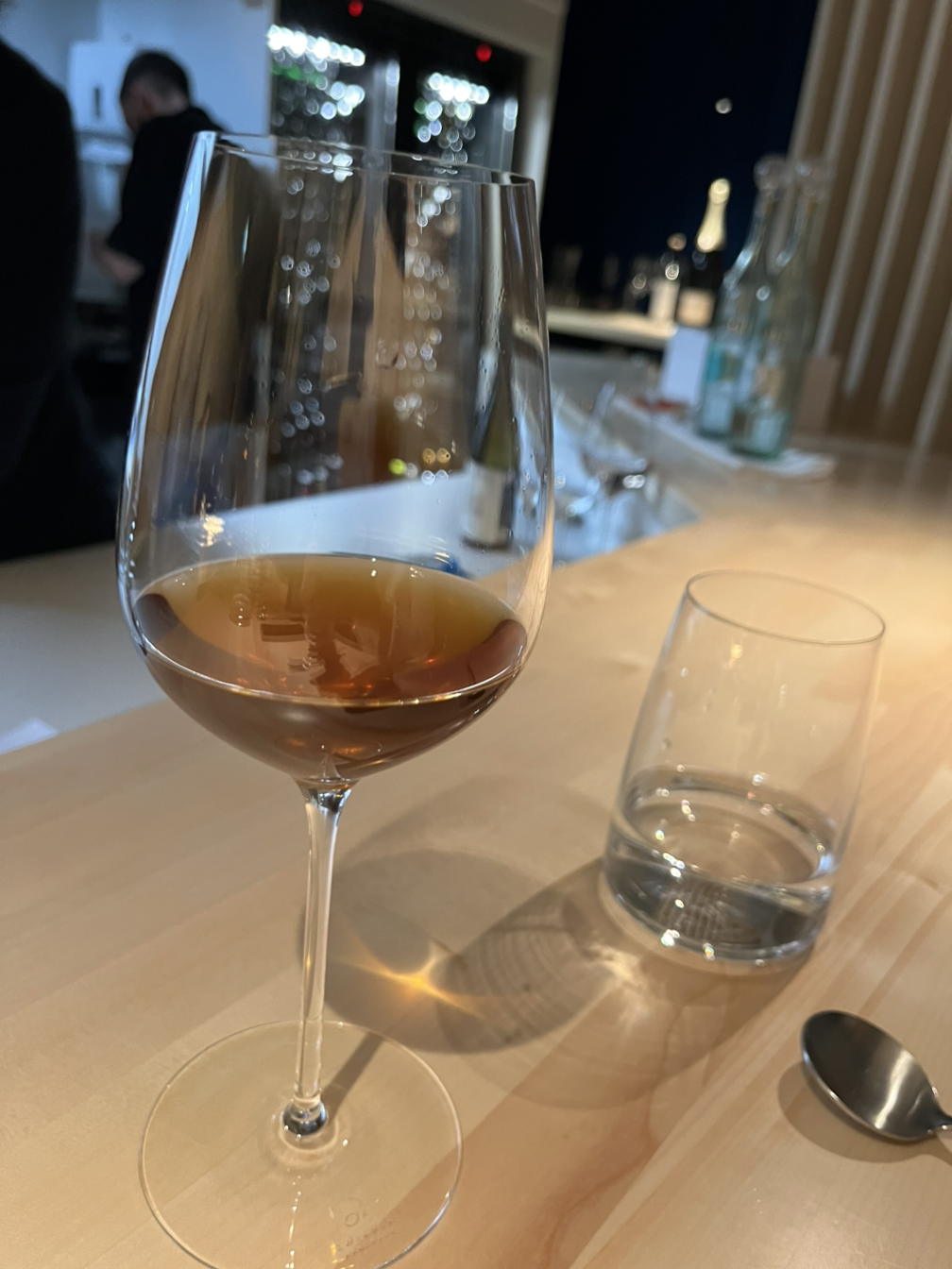 그의 신선한 메뉴들에 놀라워하며 식사를 이어나가는 중, 나를 제일 놀라게 했던 것은 바로 함께 페어링 된 칵테일이었다. 논알콜 페어링 음료로 나온 음료 모두 조합이 신선했지만, 이 음료를 마셔보고는 익숙하면서도 새로운 맛에 눈이 확 뜨였다. 옥수수 수염차에 간장을 한두방울 섞은 맛이었다. 맛을 떠나서, 어떻게 이런 생각을 할 수 있었을까. 한국사람이라면 페어링 음료로 이 조합은 아무도 생각하지 못했을 거라는 생각이 들어 신기하기까지 했다. (물론 개인적으론 그냥 옥수수 수염차가 더 좋긴 하며, 음식은 전반적으로 좀 짠편이었다. 하지만 이는 독일 현지인들 입맛에 맞춘 것이라 생각된다.)