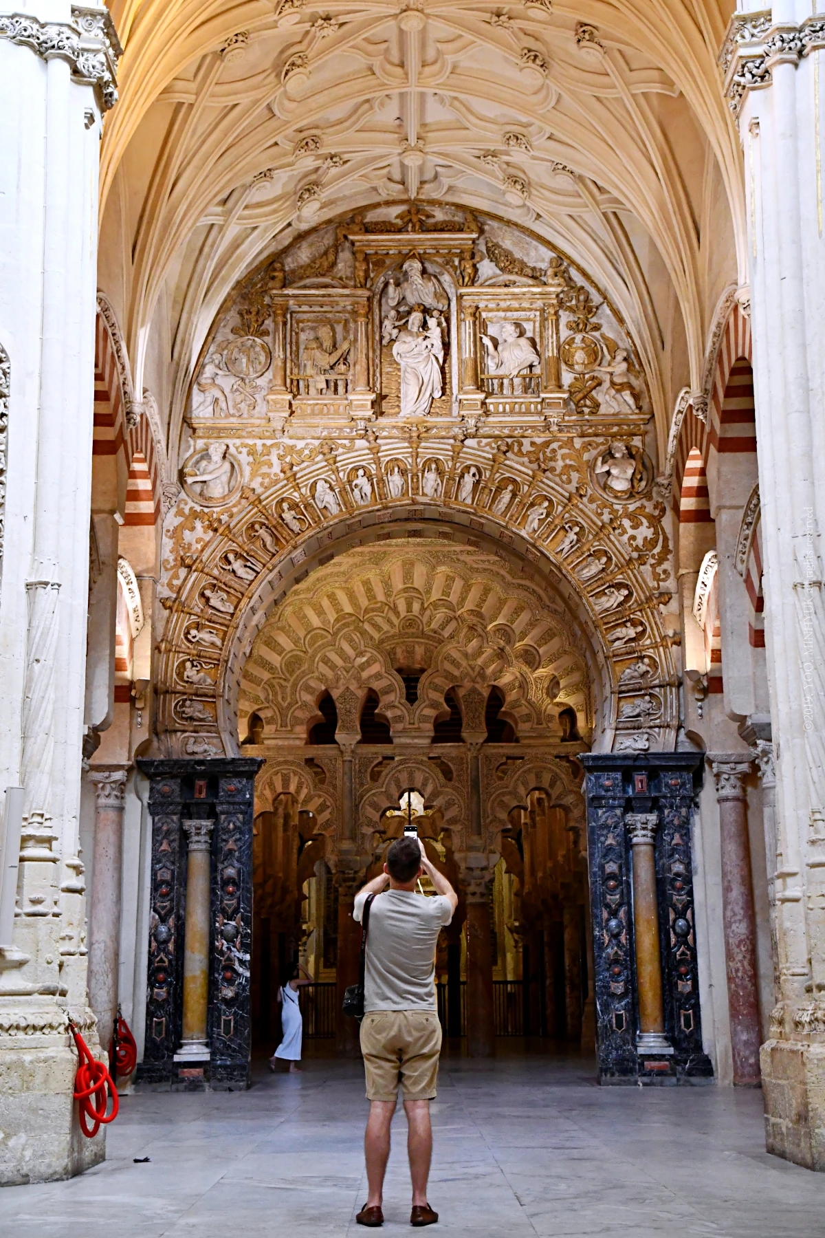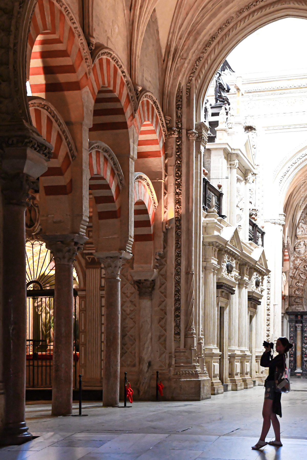 메스키타 실내에 들어가니까 제일 먼저 ‘코린트 식’이라 불리는 고대 그리스 건축 양식으로 된 기둥을 볼 수 있었고, 기둥과 기둥 사이에 로마가 발달시킨 건축술 ‘아치’ 발견할 수 있었다. 다만 이슬람의 아치 형태는 로마와는 약간 변형된 모습이었으며, 낮은 천장을 높게 보이게 하는 ‘이중 아치’로 자신들의 건축술을 과시하는 것 같은 느낌까지 들었다. ‘줄무늬’또한 말발굽을 연상시키며 확실히 아랍의 색채를 갖춘 디자인이었다. (원래 유럽에 ‘말(馬)’이 없었기 때문에 말을 탄 ‘기병’으로 구성된 아랍 사람들과의 전쟁에서 참패했다는 이야기도 있다. 말은 아랍의 상징적 의미였으니 이렇게 디자인했을 수도 있을 것 같음)