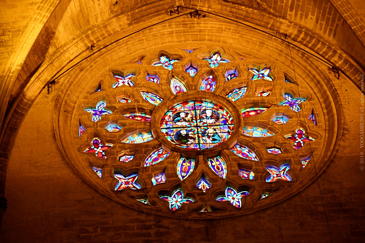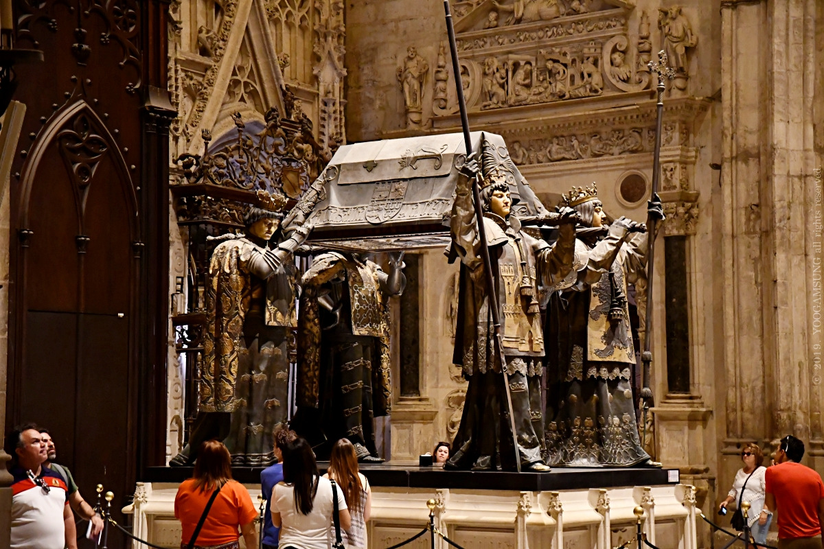 저는 '힐링형 여행자'가 되고 싶은데, 매번 '학습형 여행'을 하게 됩니다. ㅎㅎ 세비야 대성당 안이예요. 꽃무늬로 된 스테인드 글라스가 보이고, 역대 스페인 네 명의 왕이 콜럼버스의 관을 들고 있는 게 보입니다.