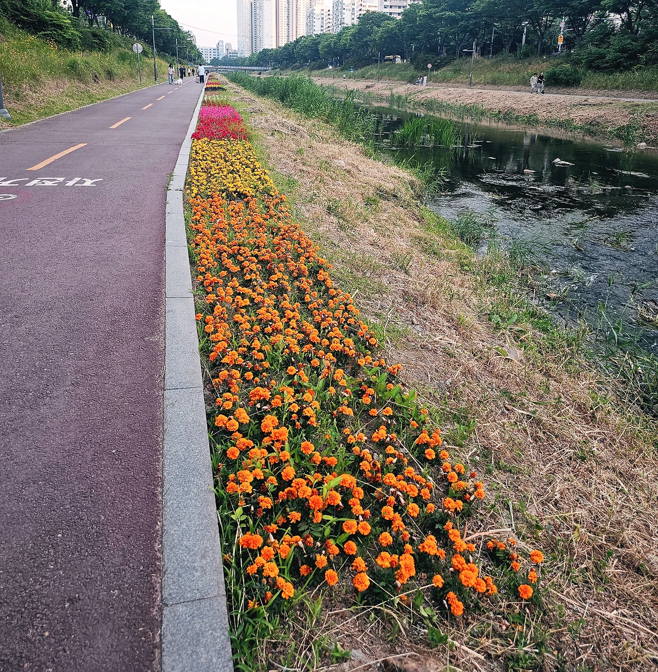 그저 아파트 단지를 산책하는 것보다 조금 걸으면 나오는 강이흐르는 산책길이 있다는 것은 참 행운인 것 같다. 대채로운 자연의 색들과 다양한 사람들을 구경할 수 있고, 도심 속 줄지은 상점가가 아닌 빼곡한 나무들과 풀, 꽃을 볼 수 있음이 정말 큰 행운이다.