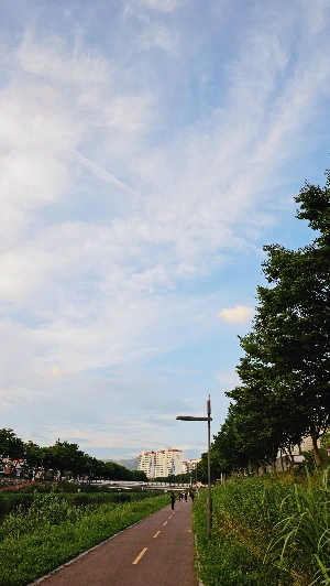 우리집 근처의 산책길은 강을 끼고 가장가리 양 옆으로 길이 나있다. 가운데 강은 시냇물과 같이 얕은 곳은 발목만큼, 깊은 곳은 고작 무릎 정도 밖에 오지 않는 깊이를 가졌다. 얕은 강물은 유독 계절의 하늘을 잘 반사해 시시각각으로 물 색이 변하곤 한다. 한낮엔 푸른빛의 하늘이 반사되고, 해질녘엔 붉은 노을이 반사되어 또다른 분위기를 선물해준다. 주변의 나무들도 바람과 하늘을 반사하듯 계절을 잘 보여준다.
