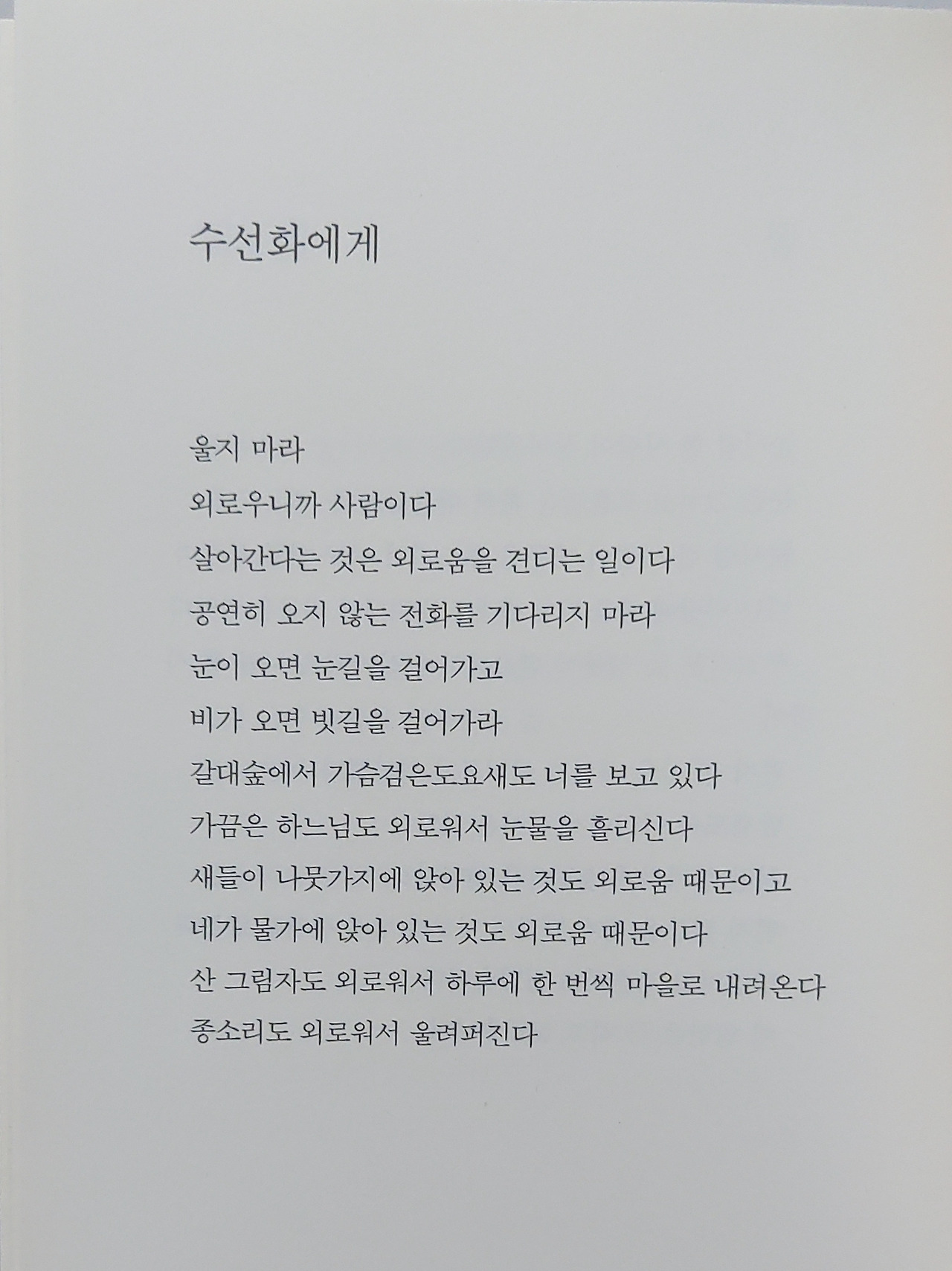 그리고, 그것이 모두가 동일하게 느낄 수 있는 감정이라면, 시인의 다른 작품처럼 서로가 서로의 외로움을 연민함으로써 버텨낼 수 있지 않을까.