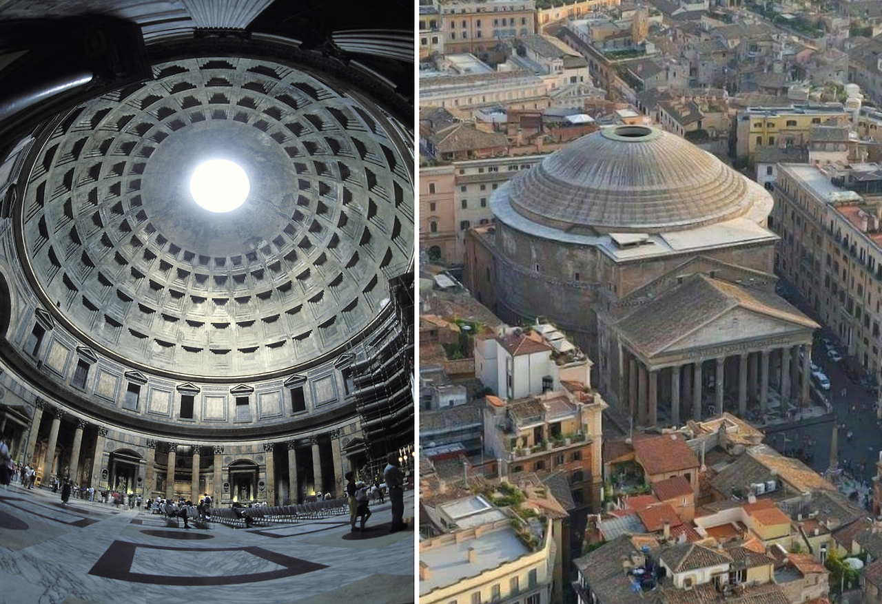 판테온 내부 궁륭(좌), 판테온 외부 전경(우) / 130년 경