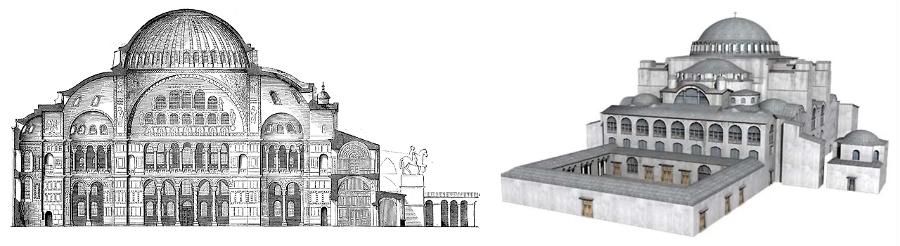 건축 당시, 성 소피아 성당 단면도(좌) 및 3D 조감도(우)