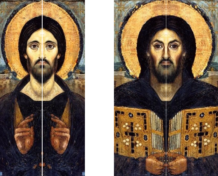 판타크라토르 이콘 합성 이미지, 인간적인 속성(좌) / 신적인 속성(우)