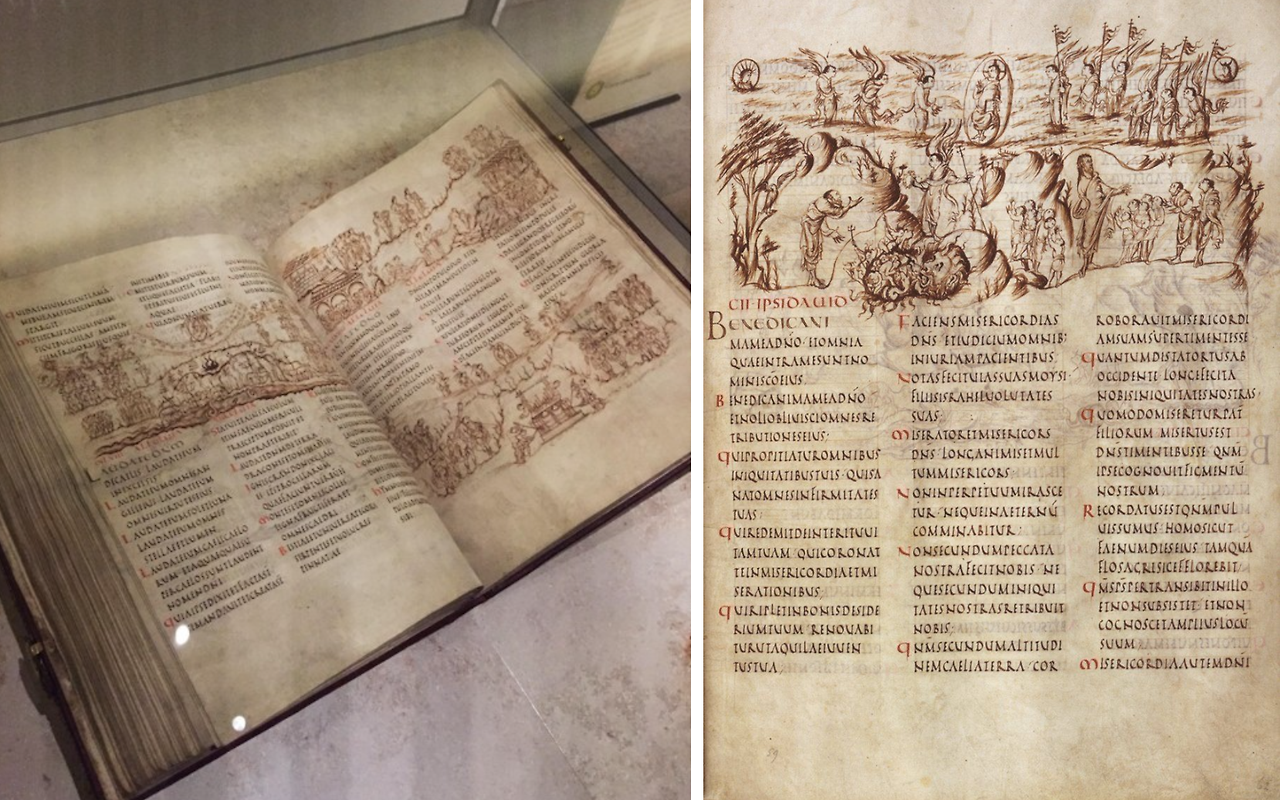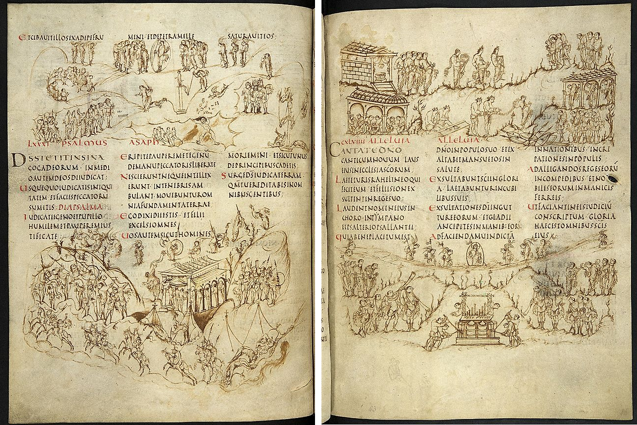 아무튼, '카롤링거 르네상스'미술의 대표 걸작 중 하나가 성경 필사본에 있었으니 <위트레흐트 시편집>이다. 108장의 송아지 피지가 사용된 이 시편집은 생동감 넘치는 '펜'으로 그려진 166개의 일러스트가 각 시편들을 표현하고 있는 것이 가장 큰 특징이다. 한때 6세기 작품으로 여겨지기도 했는데 4~5세기 후기 로마 시대에 제작된 필사본과 시각적으로 거의 흡사했기 때문으로 글씨체와 건물, 풍경, 동물, 복식 등이 후기 로마의 양식을 그대로 따르고 있다.