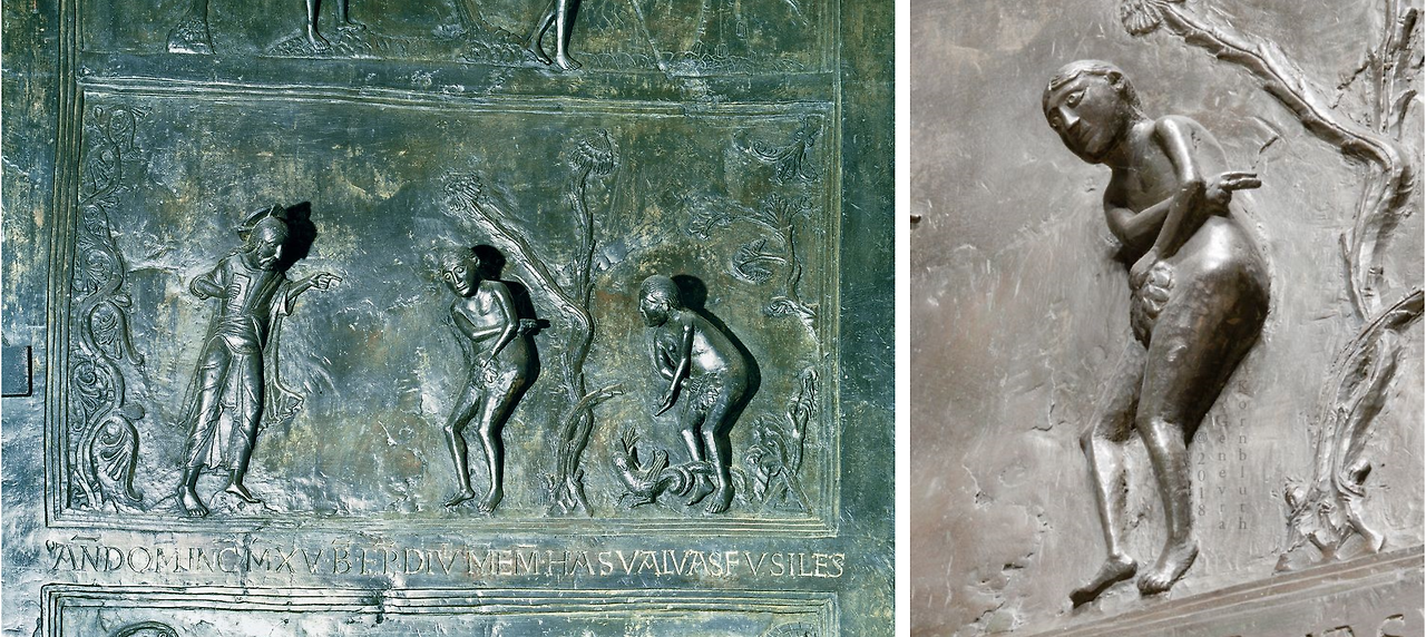 베른바르트 청동문의 '타락한 아담과 이브'(좌)와 '아담' 확대(우)