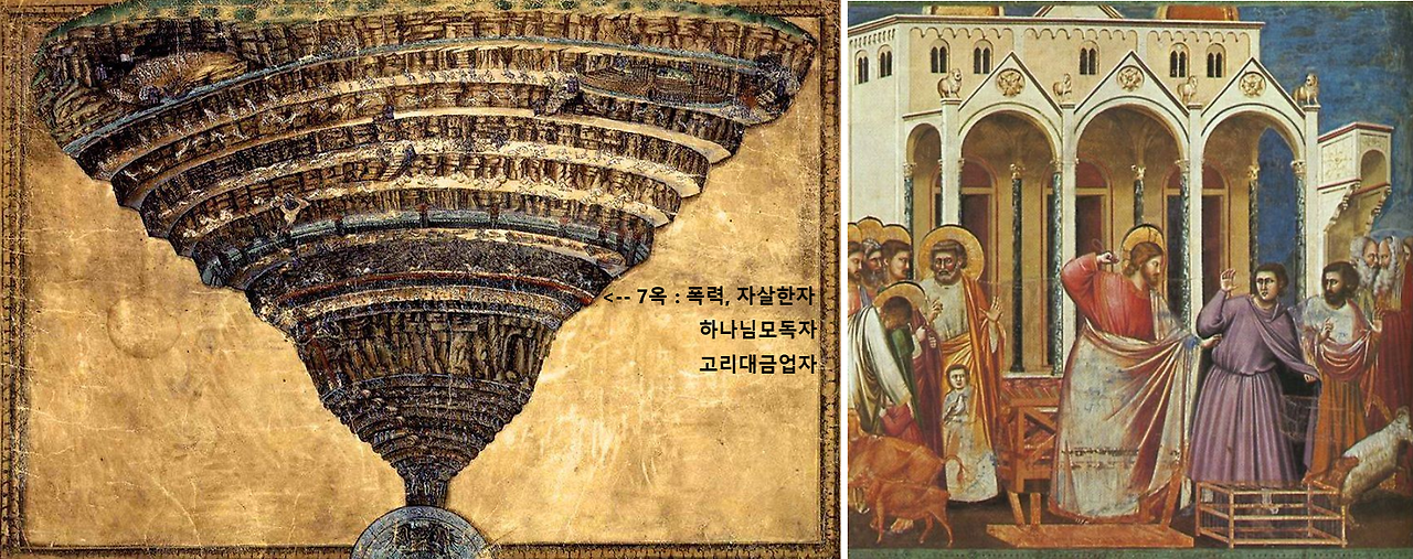 단테의 '신곡' 중 지옥도 by 보티첼리/1490년 경(좌), 환전상을 쫓아내는 그리스도 by 조토/1305년 경(우)