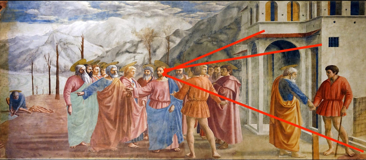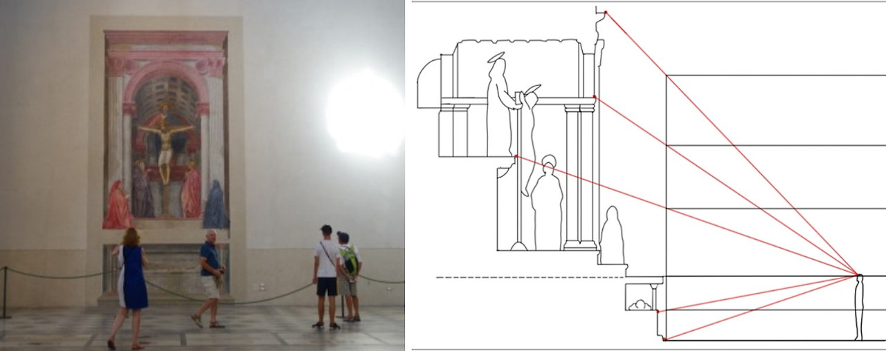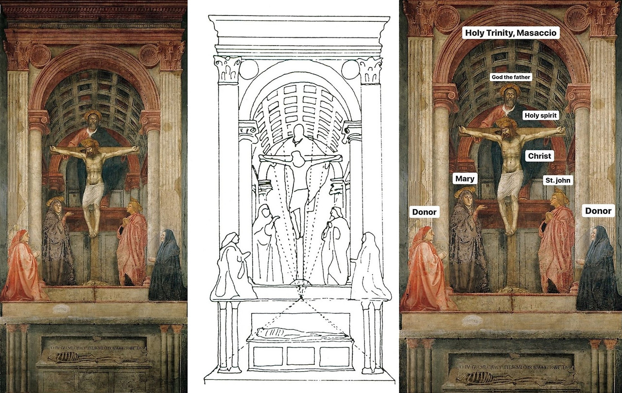 이러한 수학적인 법칙에 의거해서 그려진 최초의 그림이 '마사초'의 <성삼위일체>이다. 알려진 바로는 동시대에 피렌체에서 활동한 브루넬레스키와 마사초는 친밀한 관계였고 브루넬레스키의 이 획기적인 발견을 자연스럽게 마사초에게도 전수가 되었을 것이라 짐작하고 있다. 27세의 짧은 생으로 마감한 '마사초'는 많은 그림을 남기지는 못했지만 르네상스의 천재 중 한 명으로 추앙받고 있으며 '레오나르도 다 빈치'도 이들 추앙자 중 한 명이었다.