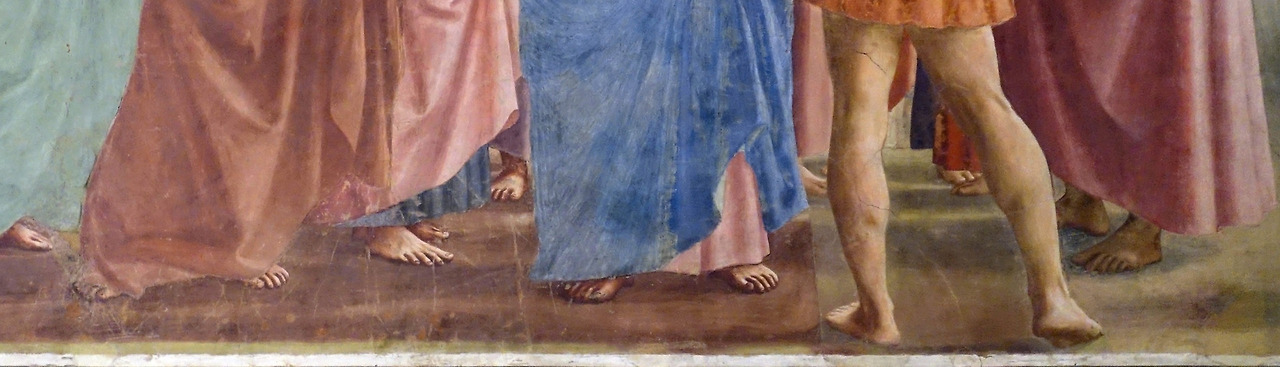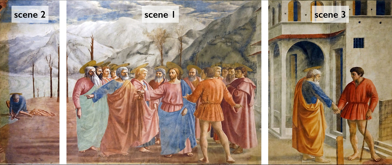 위의 프레스코화는 한 그림에서 3개의 장면을 담고 있는 연속 서사 방식의 그림으로 성경의 마태복음 17장 27절을 표현하고 있다. 위의 세 장면을 통해 성 베드로는 3번 등장하는데 파란색의 상의와 오렌지색의 토가를 걸치고 있는 인물로 특히, 장면 2에서 물고기 입에서 돈을 꺼내는 인물 또한 성 베드로이니 잊지 말기 바란다.
