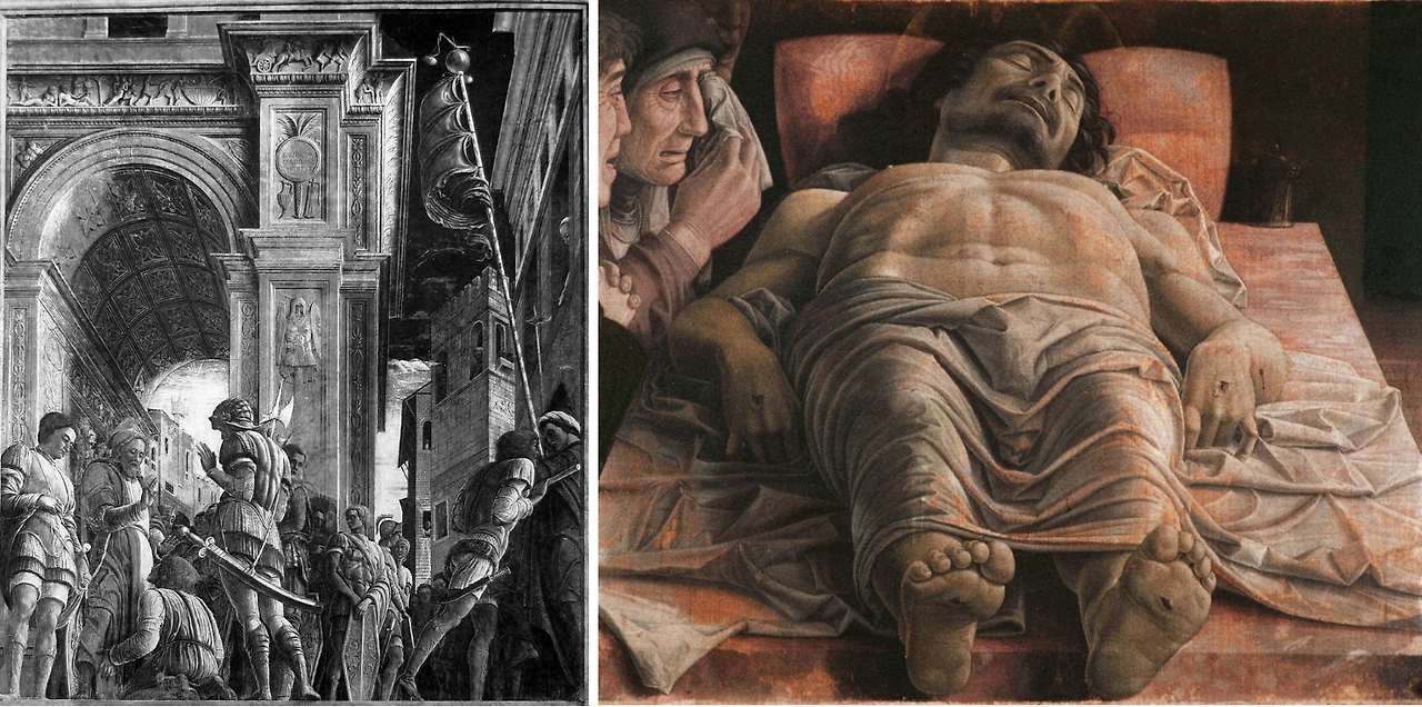 1431년생인 '안드레아 만테냐'는 이탈리아 북부의 만토바라는 도시에서 주로 활동했는데 당시 같은 도시에서 잠깐 활동했던 르네상스 최초의 조각가 '도나텔로'(8-2장 참고)의 영향을 깊이 받았다. '도나텔로'의 해부학적 인체표현과 감정의 극적인 표현은 '마테냐'만의 회화적 원근법과 어우러져 입체감과 공간적 착시효과를 극대화시켜 시청자에게 강렬한 감정을 전달한다. 특히, 사물과 사물 간의 공간뿐이 아닌 인물자체에까지 원근을 적용한 극단적인 '단축법'의 혁신은 그의 가장 위대한 업적이라 할 수 있다.