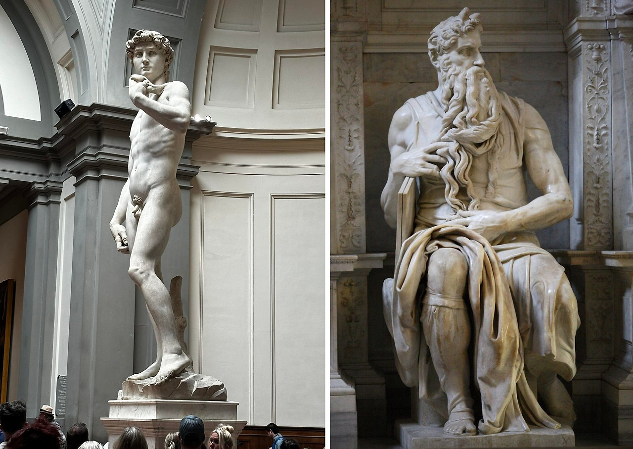 '미켈란젤로'는 단순히 고전을 모방하는 데 그치지 않고 <다비드>의 당당함, <모세>의 힘찬 표정과 자세 등 독창적인 조형 언어를 창조하였고 때로는 감정과 역동성을 강조하기 위해 신체 비례를 왜곡하여 극도로 이상화된 조형미를 추구하며 '후기 르네상스 매너리즘'에 깊은 영향을 주었다. 그는 '르네상스는 이런 것이야'라고 정의하는 동시에 그 한계를 극복한 '르네상스적 인간의 전형'으로 평가받으며 예술적 영감과 경외의 대상이 되었다.