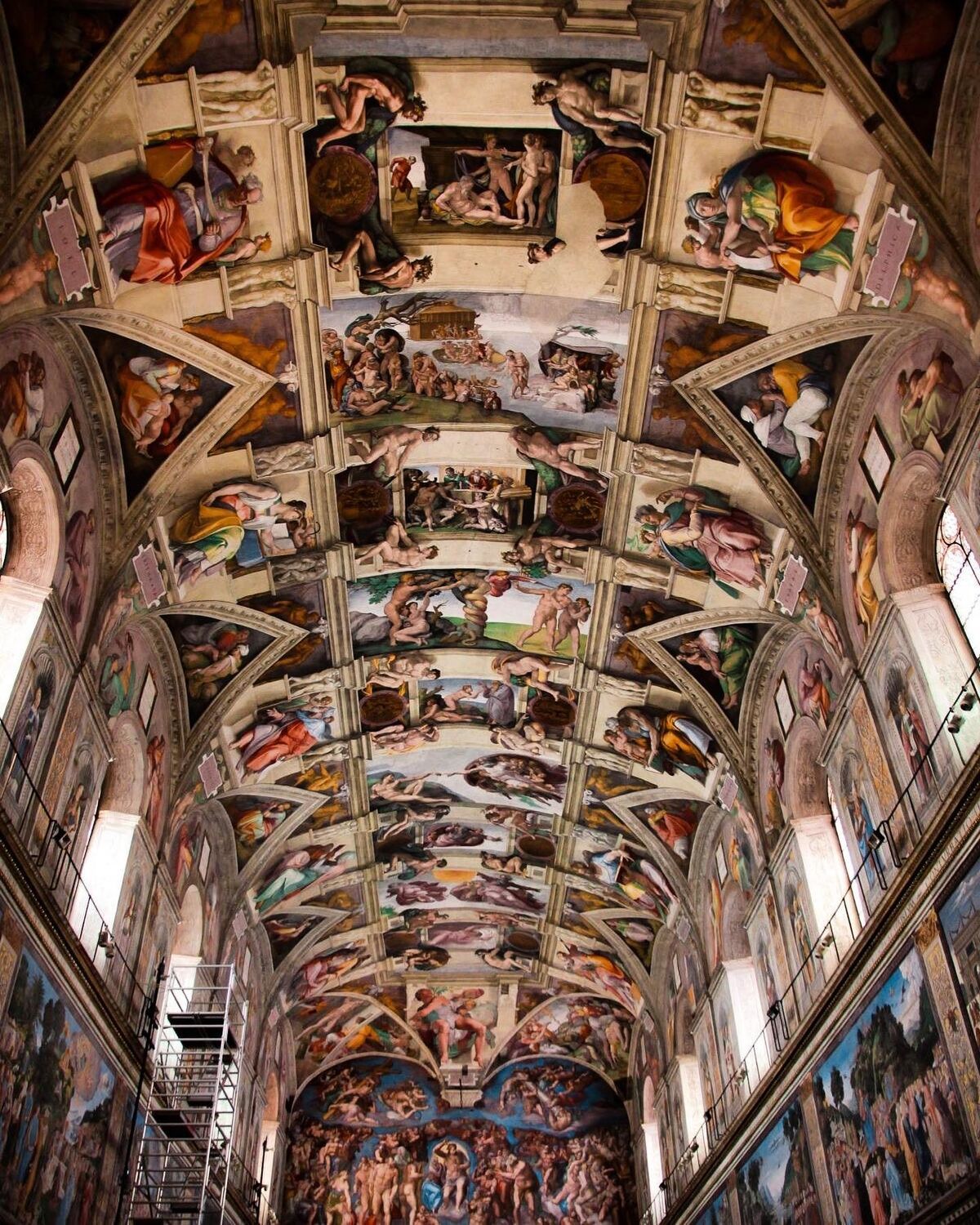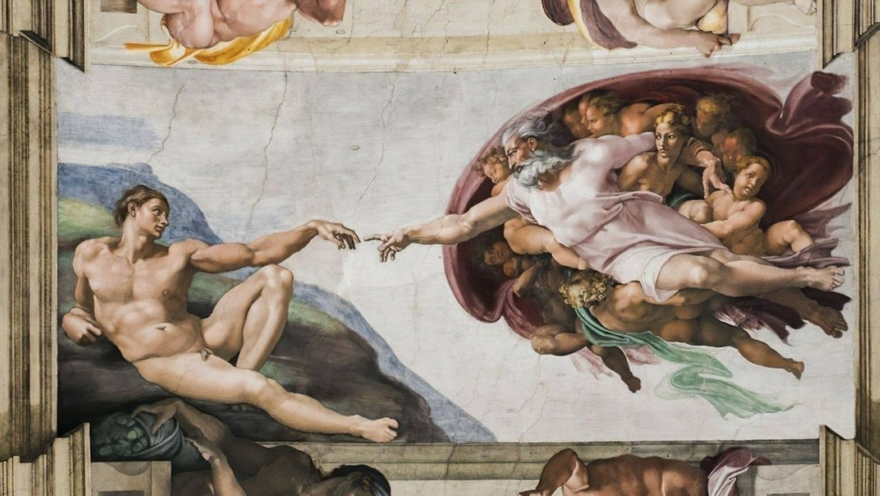 특히, 천정화 중 가장 유명한 그림은 4번째에 위치한 <아담의 창조>로, 천정화 작업 막바지에 그려졌다. 하나님이 지천사(智天使)들에게 둘러싸여 있고 알몸의 아담이 이를 아련하게 보며, 그의 왼팔을 뻗어 생명의 기운을 하나님으로부터 건네받으려는 장면이다. 그러나, 둘의 손가락은 아직 닿지 않아 아슬하기에 긴장감을 극대화시키는데, 이는 인간의 창조가 아직 완성되지 않았음을 암시하며 인간 존재의 본질적 불완전성을 상징한다.