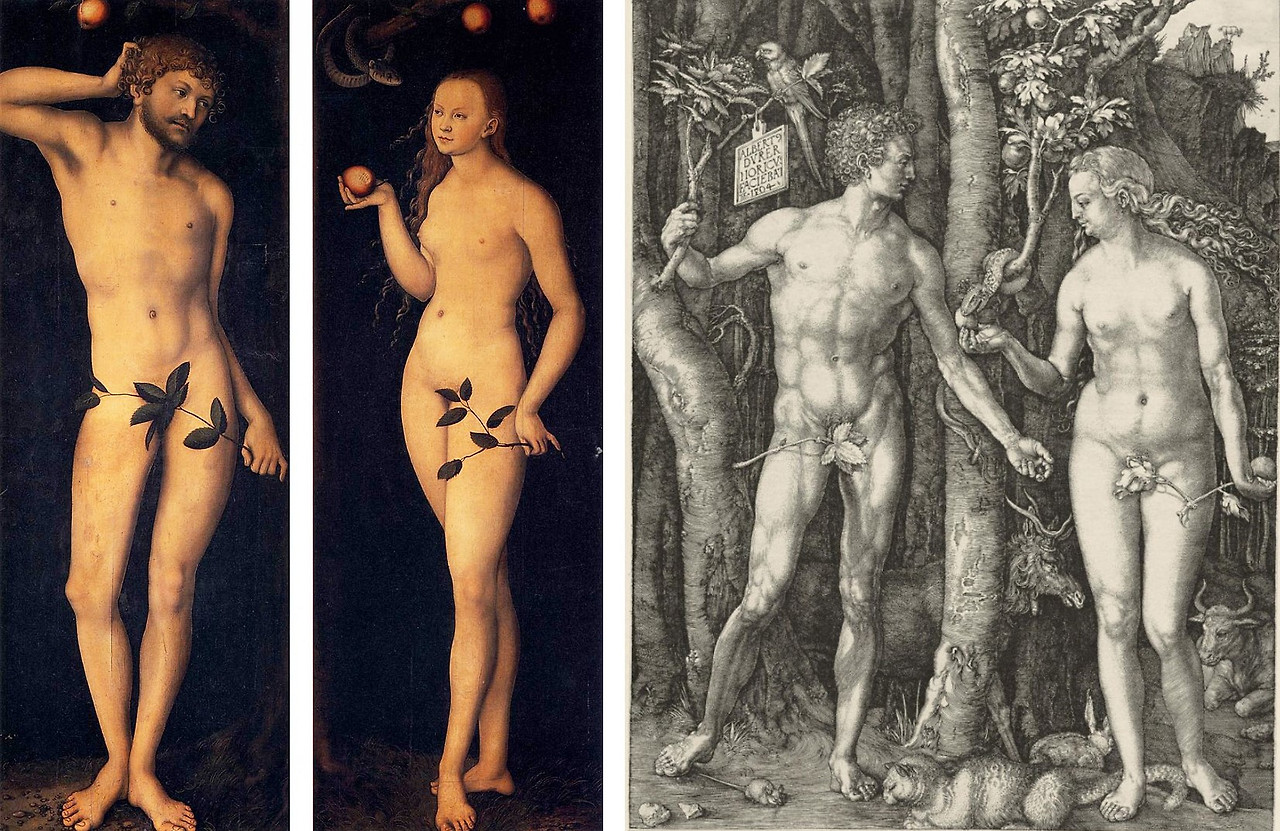 그의 대표작 중 하나인 <아담과 이브>는 근육이 강조되지 않은 매끄러운 선과 우아한 인체 표현이 특징으로 부드러운 색감과 균형 잡힌 명암 처리를 통해 인물의 입체감을 강조했다. 이와 비교하여 '뒤러'의 <아담과 이브>는 고전적인 인체 비례와 해부학적 정확성을 탐구하여 표현한 것을 볼 수 있다. 특히, '크라나흐'의 인물들은 비례가 비현실적으로 길고 왜곡되어 보이고 매끈하고 창백한 색감을 사용하여 마치 마네킹처럼 보이는데 이것은 단순한 성서적 재현이 아닌, 세속적이고 장식적인 포즈가 강조된 의도된 표현방식으로 그만의 독창적인 양식으로 평가받는다.