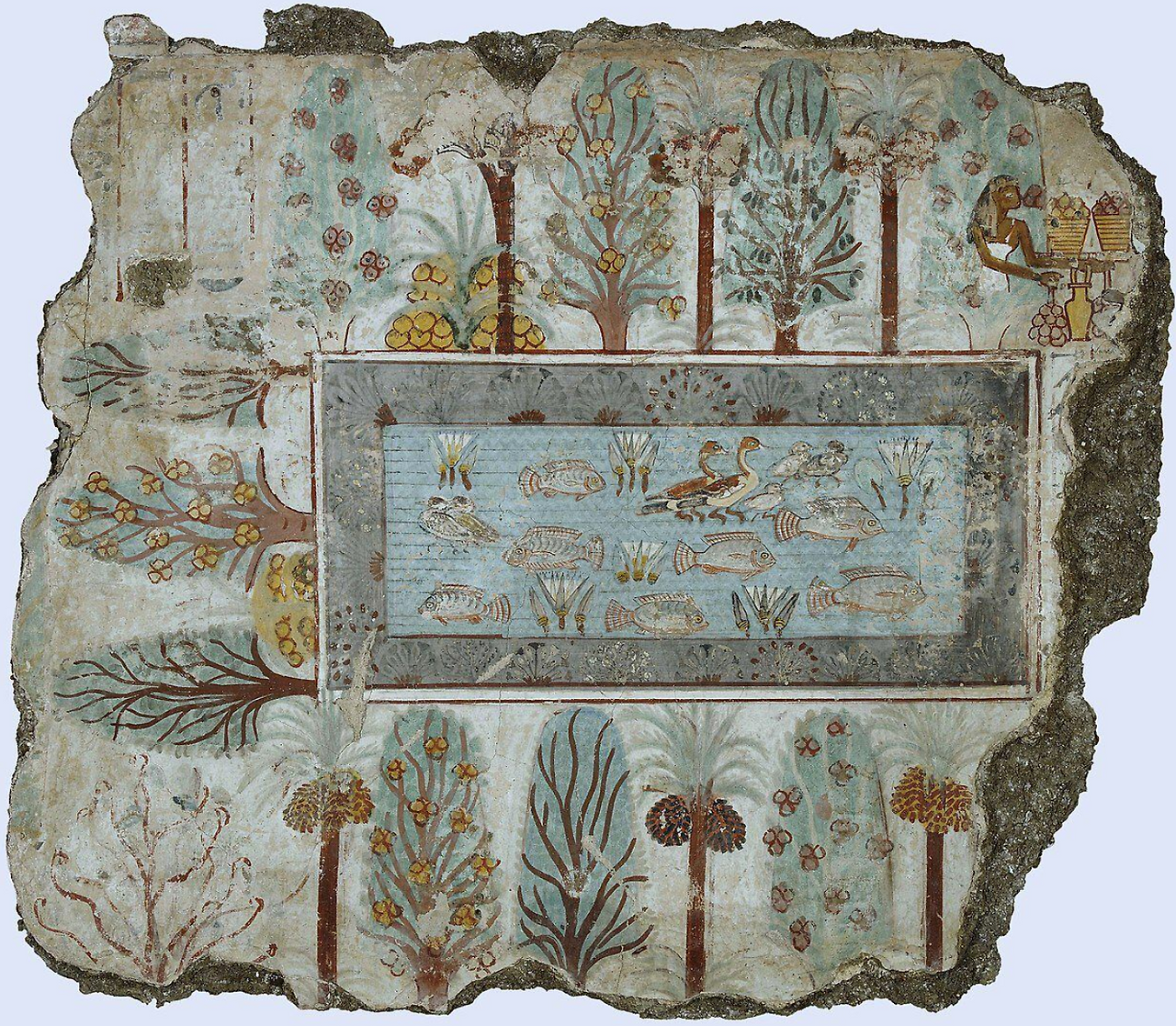 이렇게 선사시대의 미술과 유사한 목적을 가지고 있는 이집트 미술은 그것을 표현하는 방법에 있어 크게 두 가지 특징을 가지고 있다. 첫 번째는 양식화된 스타일로 우연한 각도에서 보이는 대로의 자연의 모습을 그리지 않았다. 마치 지도를 그리듯이 자연이나 사물의 특징을 가장 잘 보여줄 수 있는 각도를 잡아 엄격한 규칙에 따라 그렸다. BC1400년 경 테베라는 도시의 서기 및 곡물계수관이었던 ‘네바문’이라는 관리의 무덤에 그려진 벽화를 보면 그 특징을 잘 알 수 있다. 나무들의 모양과 특징은 정면에서 보아야 가장 잘 알 수 있고 연못의 형태는 위에서 보아야 그 형태와 크기가 명확해진다. 연못 속에 있는 물고기와 새들 또한 그 특징을 가장 잘 보여줄 수 있는 각도를 잡아 그려져 있다.