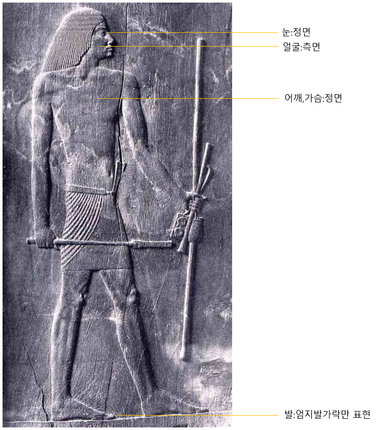 헤지레의 초상 / BC 2778~2723년 경“머리는 옆으로 보일 때 가장 쉽게 볼 수 있어 옆모습을 그렸다. 우리가 인간의 눈을 생각할 때는 대게 정면에서 본 것을 기억한다고 한다. 그래서, 측면의 얼굴에 정면의 눈이 그려져 있다. 어깨와 가슴은 정면에서 그 모습이 가장 잘 드러나 두 팔이 몸에 어떻게 붙어 있는지를 볼 수 있다. 이집트의 미술가들은 양쪽 발을 시각화하는 일이 어렵다는 것을 알았다. 그래서, 엄지발가락으로부터 위쪽으로 연결되는 발의 분명한 윤곽선을 그리기를 더 선호했다. 그래서, 두 다리는 안쪽에서 본모습으로 그려져 마치 두 개의 왼쪽 다리를 가지고 있는 것처럼 보인다.”