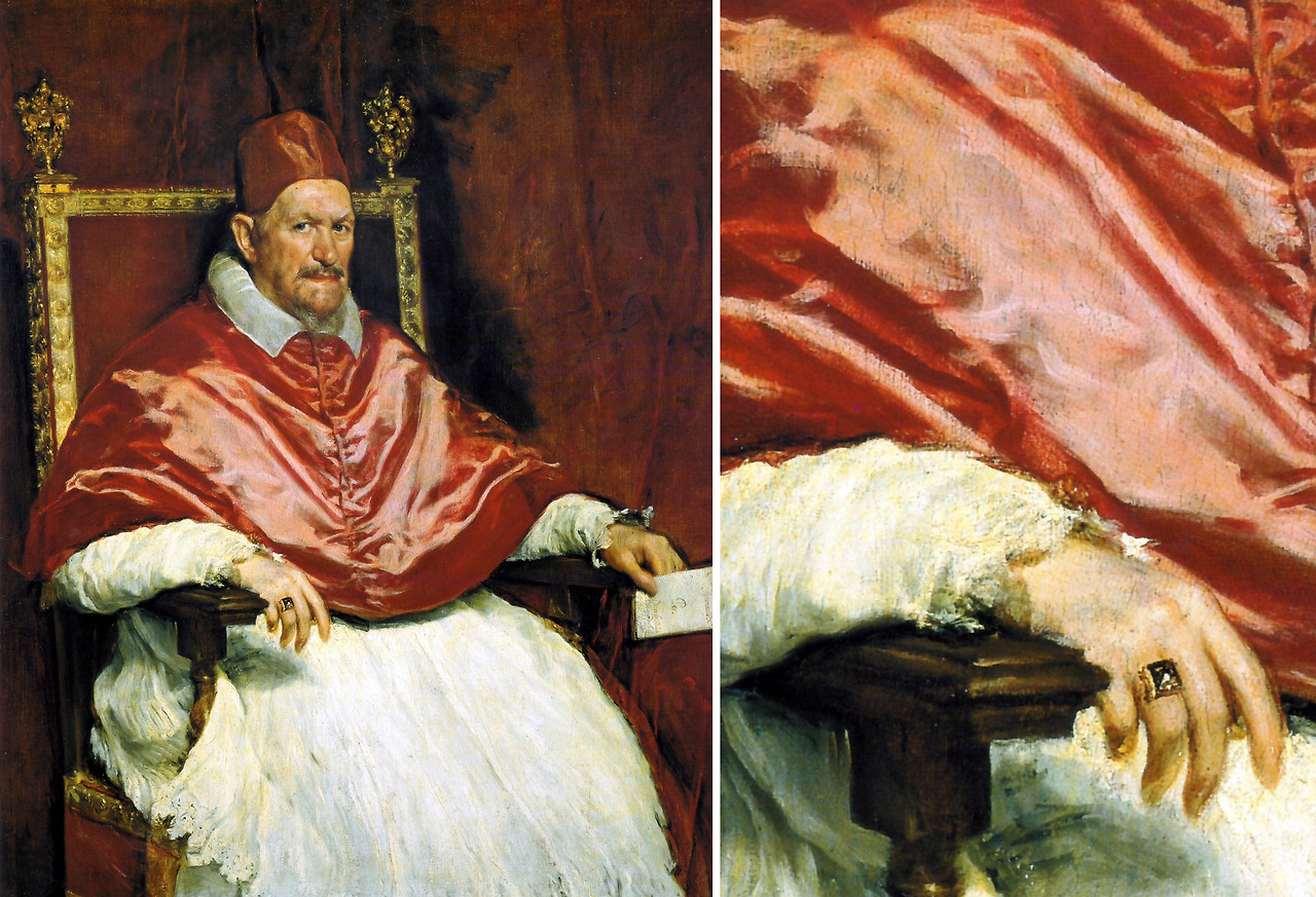 예를 들면, 나무는 초록과 갈색의 덩어리로 빛의 각도와 공기의 밀도에 따라 같은 색이라도 조금씩 다르게 보이고, 아침에 보는 나무와 밤에 보는 나무의 색감이 완전히 달라 보인다. 형태 또한 빛에 따라 그림자가 바뀌어 미세한 유동성을 가지게 된다. 이런 개념으로 그림을 그린다는 것은 결국, 붓터치를 정교하고 매끈하게 발라버리면 형태와 색감이 고정되기 때문에 빛의 성질을 제대로 표현할 수가 없게 되어, 이것을 극복하고 대상의 유동성을 확보하기 위해 색을 작은 덩어리 단위로 찍어버리는 '그리는 방법'을 혁신한 것이다. 그래서, 벨라스케스의 그림은 꼭 실물로 봐야 그 진가를 확인할 수 있다고 하니 기회가 된다면 꼭 직관하시길 바란다.