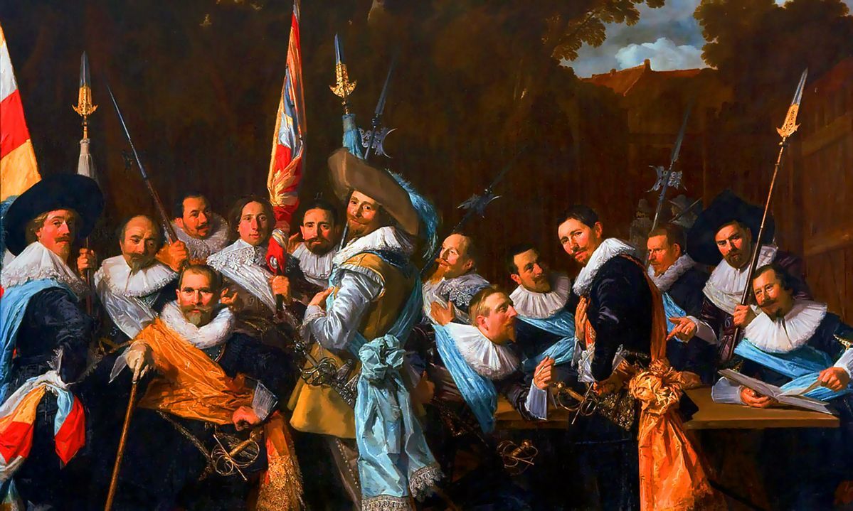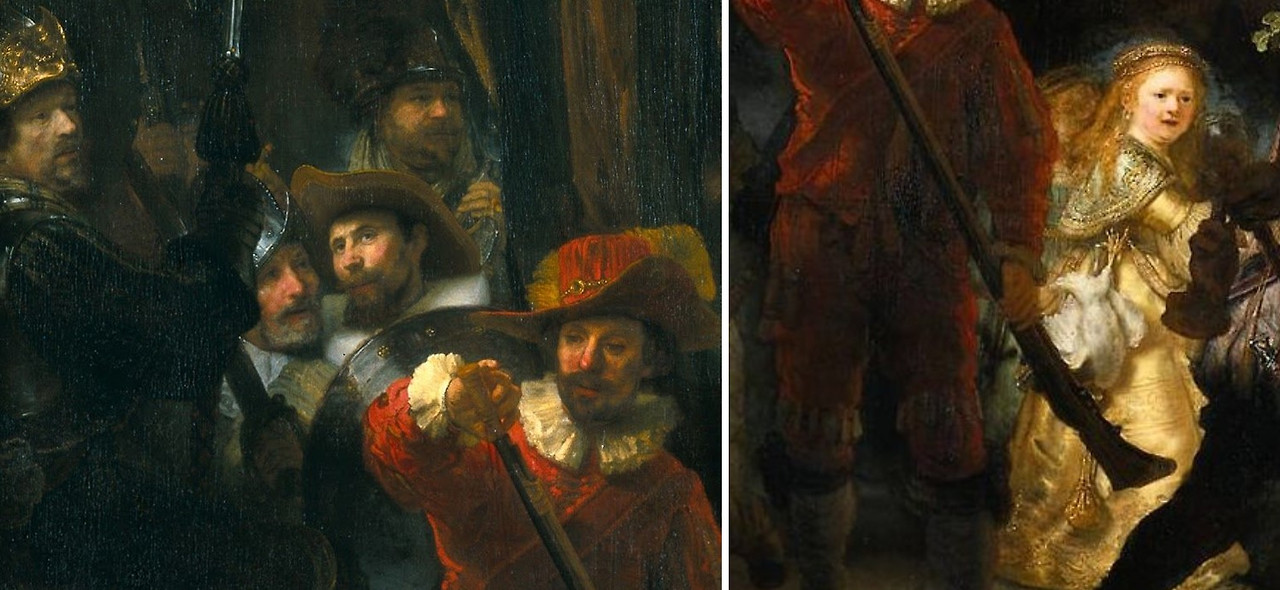 <야경>은 3.6*4.4m의 크기로 30명 이상의 인물이 등장하는 초대형 그림이다. 당시 전형적으로 그려졌던 정면 응시, 수직/수평 구도의 단체 초상화의 관행을 깬 작품으로 왼쪽에서 스포트라이트처럼 중앙의 바닝코크 대장과 부대원들에게 비추는 빛은 민병대의 역동성을, 황금빛 옷을 입고 민병대의 상징인 수탉을 들고 있는 소녀에게 비추는 빛은 수호천사의 상징성을 보여준다. 특히, 깃발을 들고 있는 병사, 총을 점검하는 병사 등 일관된 자세가 아닌 각자의 동작을 하며 마치 연극 속의 배우와 같은 생동감 있는 인물 표현이 백미인데, 단체 초상화이지만 단체 초상화처럼 보이지 않도록 그린 것이다. 구도, 인물 표현, 빛과 어둠의 활용 등 아래 '프란스'의 작품과 비교하여 보면 그 다른 점을 느낄 수 있다.