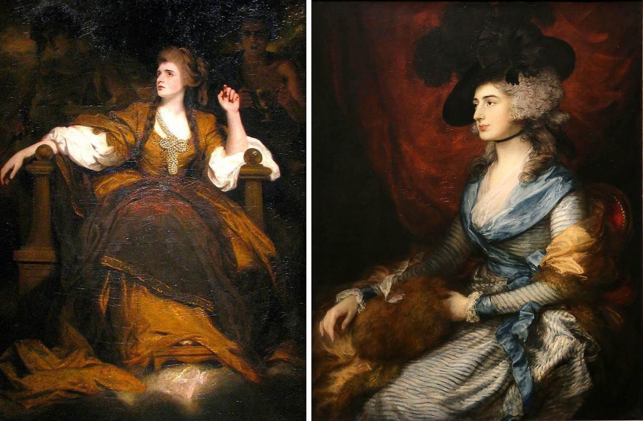 이 둘의 화풍을 당시 최고의 배우였던 사라 시돈스를 그린 초상화를 보며 비교해 보자. 같은 인물을 '레이놀즈'는 그리스·로마풍 그림을 그리기 위해 로마식 옷을 입혀 연극에 등장하는 비극적인 뮤즈로 즉, 여신의 이미지를 표현하고자 하였다. 반면 '게인즈버러'는 한 인간으로서의 시돈스를 그렸는데 극적인 조명 등 재미 요소는 조금 부족했지만, 무대 뒤 실제 모습에 초점을 맞추어 평소 입는 옷을 표현하여 인물의 개성을 포착하는 데 초점을 두었다. 어느 것이 더 좋다고 할 수는 없으나 곰브리치는 이 둘에 대해 다음과 같이 언급하였다.