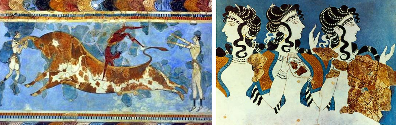 크레타 크노소스 궁전의 프레스코화, 투우사와 황소(좌), 여인들(우) / BC 1500년 경