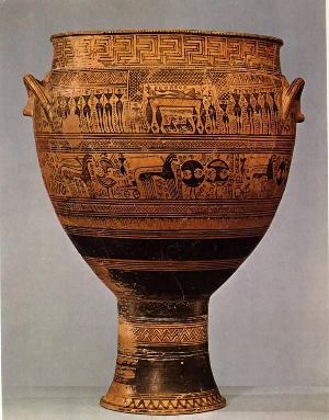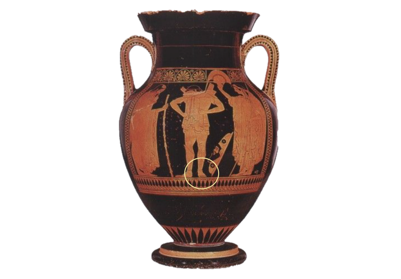 우리가 또 주목해야 할 유물이 있는데, 당시 그리스의 대표적인 수출품인 도자기이다. 생활필수품인 도자기 표면에 새겨진 그림에서도 전사들이 전투에서 싸우는 모습이나 전쟁 준비를 하는 장면들이 자주 표현되어 당시 사람들에게 전쟁의 중요성과 전사들의 역할을 강조하는 수단으로 활용되었다. 특히, 이러한 전사들과 그들의 가족을 표현함에 있어 위 '무릎'의 사건과 같은 획기적인 표현 기법을 볼 수 있으니, 인류 역사상 최초로 정면에서 본 발을 표현한 그림이다. 곰브리치의 말대로 예술가들이 눈을 사용한 이래로, 있는 그대로의 자연을 표현하는데 약 3000년이라는 시간이 걸렸으며, 이제 혁명이 시작된 것이다.