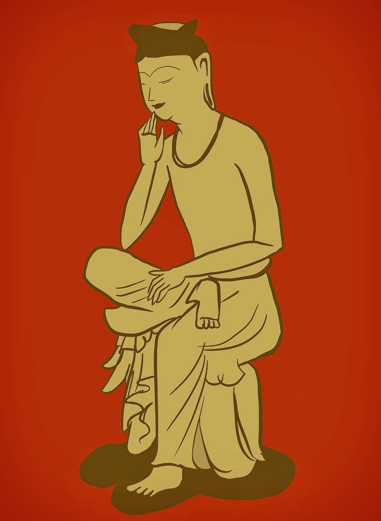 왼쪽 다리 무릎 위에 오른쪽 다리를 올린 이른바 반가(半跏)한 자세에 오른뺨에 오른쪽 손가락을 살짝 대어 마치 사유하는 듯한 자세를 취하고 이 불상은 인간의 생로병사를 고민하여 명상에 잠긴 싯다르타의 모습에서 비롯된 것이란다. 반가사유상을 보면 오귀스트 로댕의 '생각하는 사람'이 떠오르기도 한다. 후자는 사유 중인 자의 고민과 번민을 나타내고 있고, 전자는 그 과정을 끝낸 자의 깨달음이 가장 큰 차이점인 듯하다.