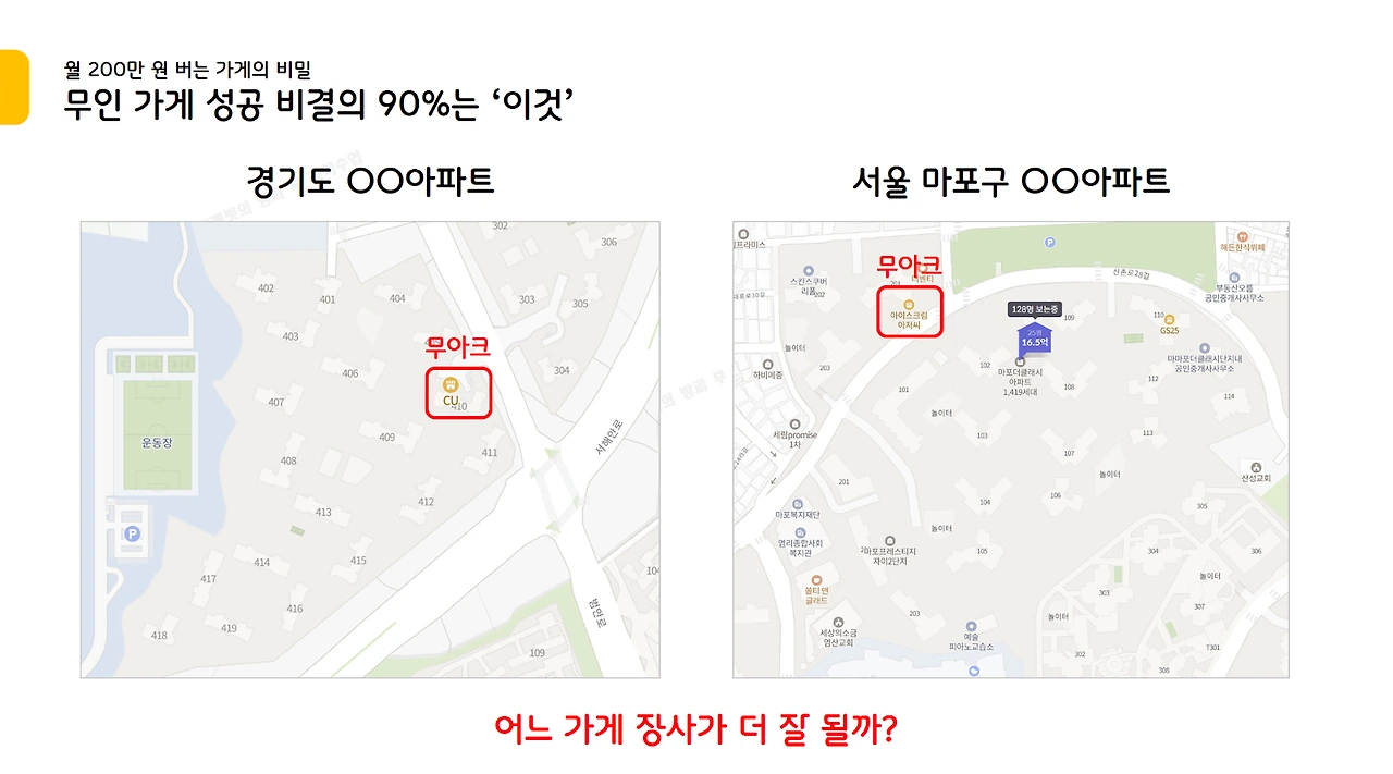 실제 이 문제를 무인 아이스크림 무료 특강 때 출제해 보았다. 서울 마포구에 위치한 아파트 무인 가게 매출이 더 높지 않을까라고 생각하시는 분들이 꽤 있었다.