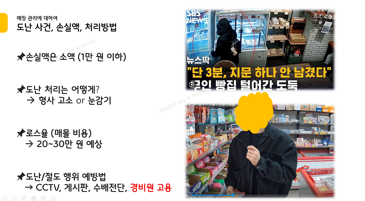 도난 한 건당 손실액은 소액이다. 많이 훔쳐가도 1만 원 이하 정도로 보면 되는데, 이런 건들이 누적되다 보면 꽤 큰돈이 될 수 있다. 가게가 관리되지 않는다는 느낌을 받으면, "깨친 유리창의 이론"이 발동해 도난 사고가 급증할 수 있으니 주의해야 한다.