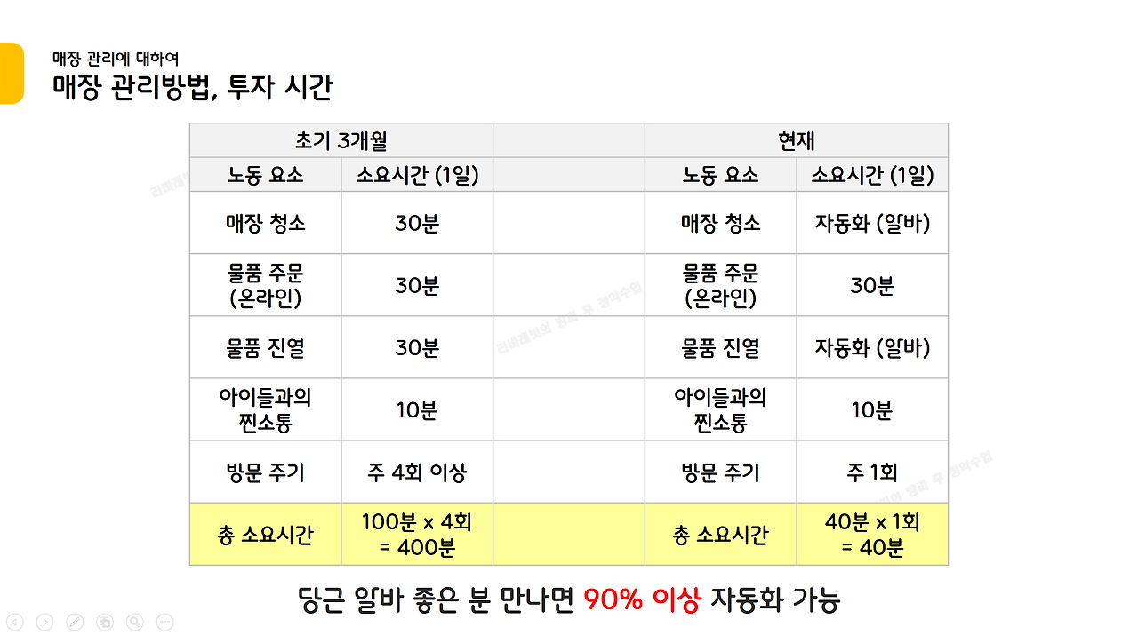 운영 초기에는 주 3~4회 이상 매장 방문이 필요하다. 각 노동요소들을 정확히 파악하기 위함인데, 손이 빠르다면 위 표의 소요시간보다 적은 시간이 들 수 있다.