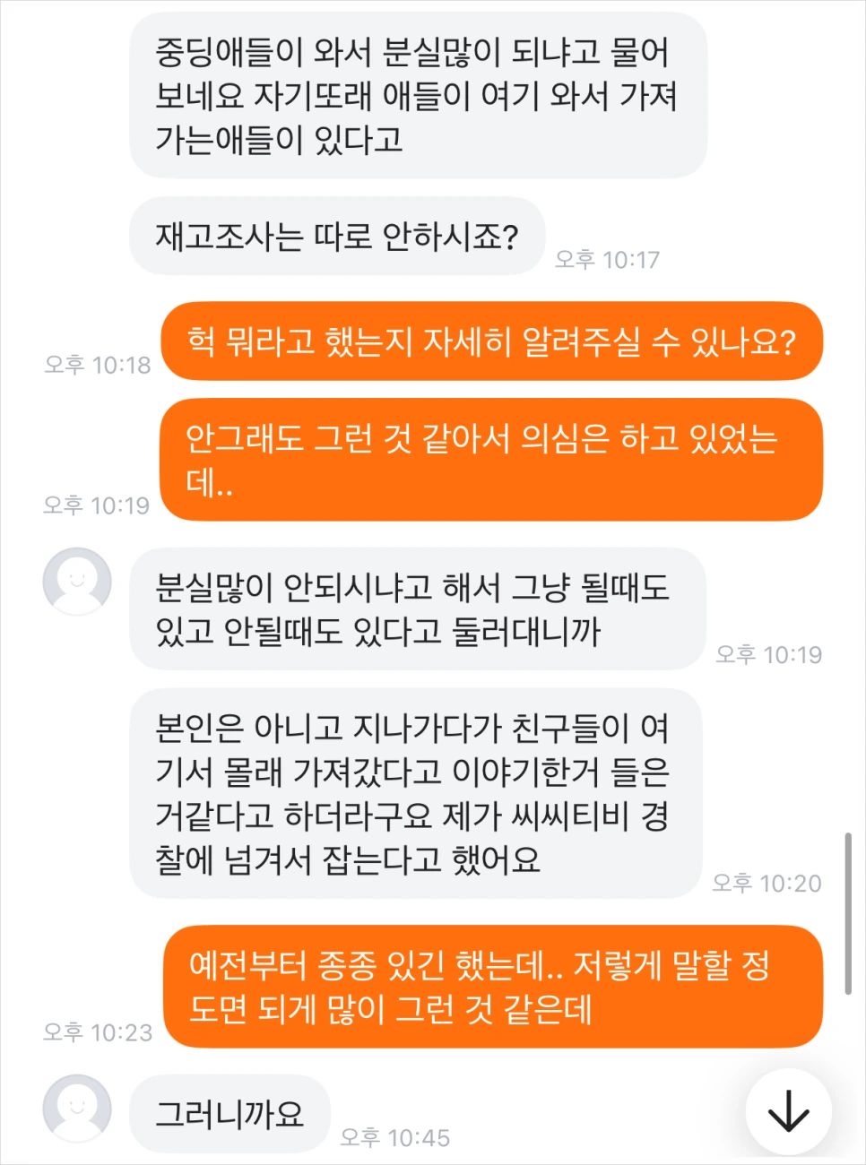 무인매장에 상습 절도범이 발생했다. 조금 전 무인 매장 알바 분으로부터 받은 비보의 당근 톡. 가게를 청소하시는데 중학생 애들이 와서 갑자기 분실이 많이 되는지 물어보았다고 한다.