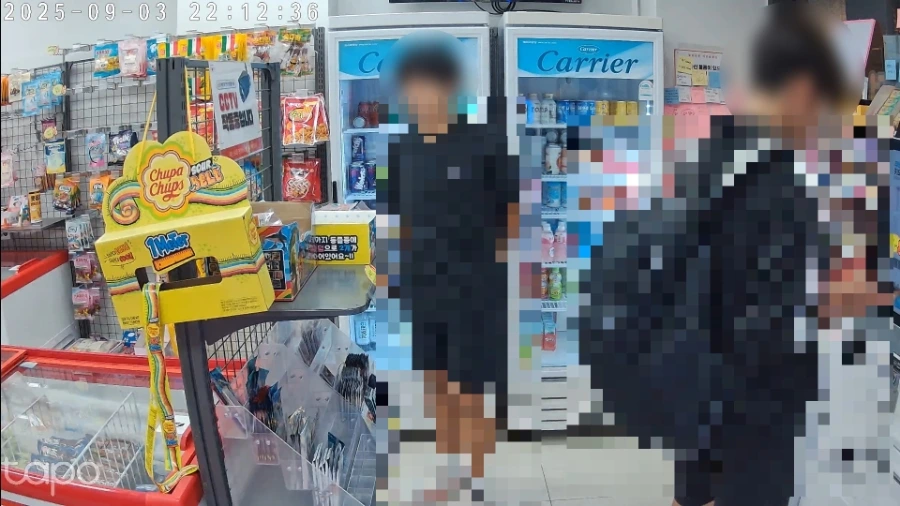 CCTV를 확인해 보니 중학생 남자아이 두 명이 무인 매장에 들어와서 갑자기 청소하던 알바분에게 물어보았더라.