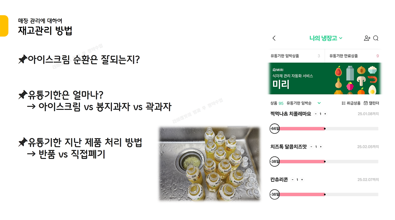 재고관리에 신경 쓰지 않으면 제품 폐기로 골치 아플 수 있다. "먹는 류" 제품을 다양하게 판매하는 매장인 만큼, 불시 유통기한 단속에 걸리지 않기 위해서라도 재고 관리에 신경 써야 한다.