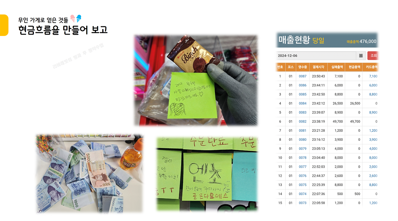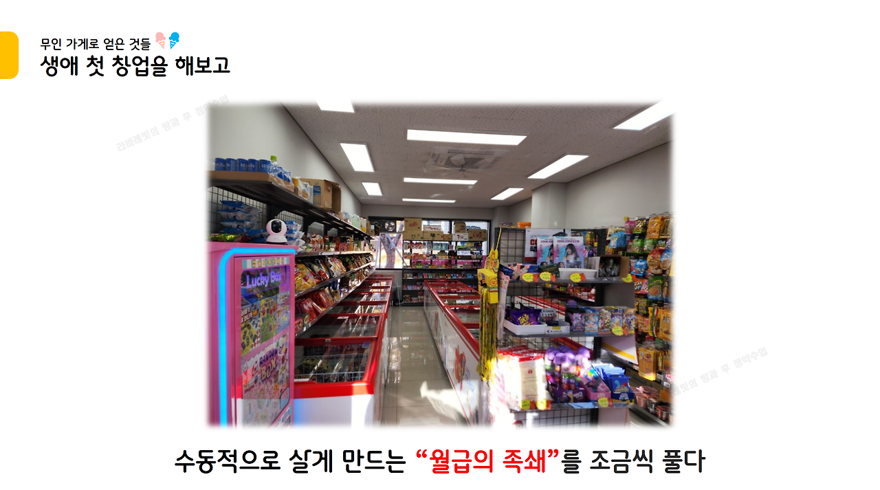 무인매장 창업의 제1순위 목표가 아닐까 싶다. 무인매장을 운영하면 바로 현금흐름이 생긴다. 물론 앞서 언급한 입지 요소를 갖춘 괜찮은 매장을 인수해야 충분한 현금흐름이 나오지만, 잠을 잘 때도 회사에 출근할 때도 간병을 할 때도 매출이 일어난다는 것은 꽤나 신선한 경험이다.