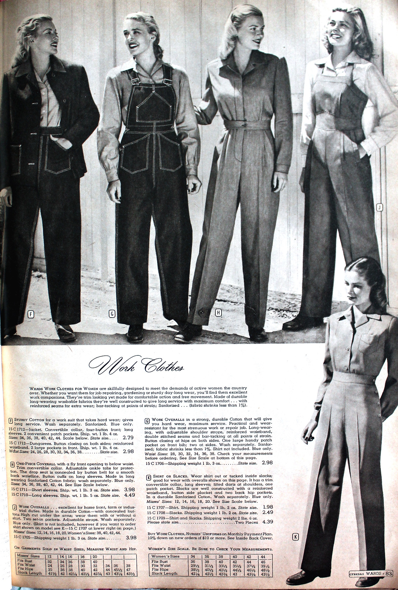2차 세계대전 당시 미국의 많은 여성들은 데님 의류를 착용하고 전장에 나간 남성들을 대신하여 군수 공장에서 근무하곤 했습니다. 이런 "Rosie Riveter" 현상이라고도 불리는 생활을 통해 여성들도 더욱 자연스럽게 근무 외 일상 속에서도 초어 코트나 청바지, 오버롤 등을 착용하게 됩니다. 1940년대 LIFE 잡지에서는 젊은 여성들이 남자 친구들의 바지를 빌려 입고 다닌다는 글도 기록으로 남아있습니다.