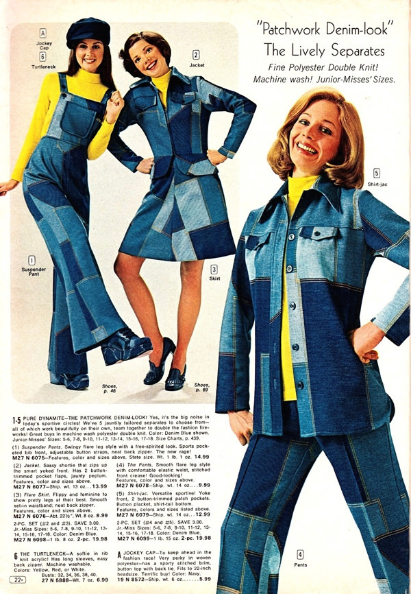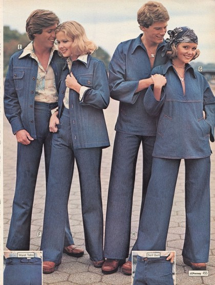 1970년대부터는 다양하고 실험적인 디자인들이 많이 늘어나게 됩니다. 청청패션으로 불리는 Canadian Tuexdo의 유행과 더 과감해진 나팔바지, 특이한 디테일들이 추가된 데님 의류가 많아지게 됩니다. 동시에 히피족들처럼 중고의류나 부모 세대의 옷을 물려받아 패치나 커스텀을 하는 문화도 이어집니다.