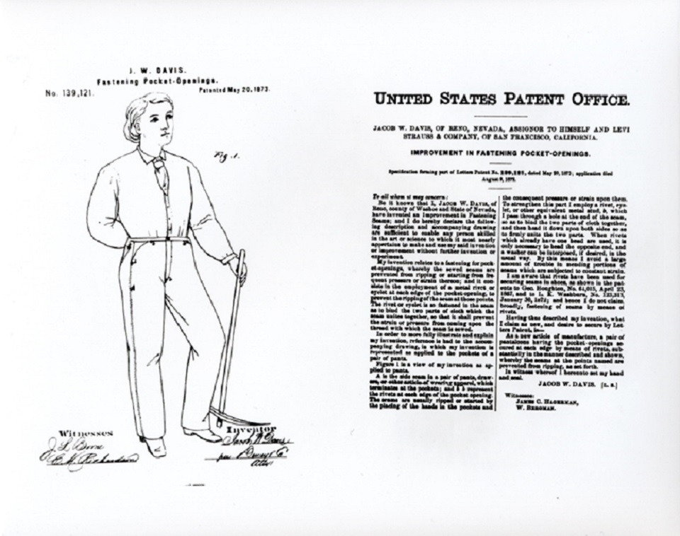 1860년대에는 텐트 천 대신 데님 소재를 이용하기 시작해 바지를 판매하기 시작합니다. 바지뿐만이 아니라 원단 자체도 판매했던 리바이스는 손님들 중 Nevada 주에 거주하던 재단사 Jacob Davis로부터 하나의 제안을 받게 됩니다. 제이콥은 네바다 주에서 농부, 카우보이, 광부, 나무꾼들 등의 노동자들을 위해 작업복을 만들었는데, 리바이스로부터 데님 원단을 공급받았습니다. 그는 말용 이불(horse blanket)에 사용되던 Rivet을 바지에 도입해 가장 장력이 많이 가해지고 쉽게 헤지는 부분에 박아 더욱 튼튼하게 만드는 아이디어를 떠올립니다. 그러나 특허를 낼 비용이 없던 그는 리바이스를 찾아가 아이디어와 동업을 제안합니다. 리바이스는 이에 동의하고, 1873년 5월 20일 그들의 특허가 인정받게 됩니다. 그렇게 리바이스는 최초로 리벳이 달린 청바지를 대량 생산하기 시작하며, 당시 원단을 보관하던 박스에 적혀있던 번호에서 착안해 그들의 청바지에 '501'이란 이름을 붙여줍니다. 1890년까지 17년 동안 특허가 만료되기 전까지 그들은 리벳이 달린 청바지를 독점적으로 생산합니다.