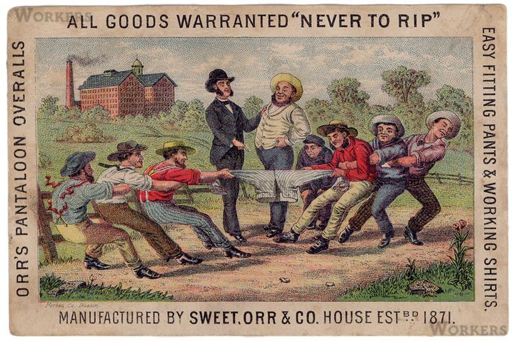 여기서 하나 짚고 넘어가야 할 점은 리바이스가 미국에서 최초로 청바지를 만든 업체가 아니라는 점입니다. 앞에서도 얘기하였듯 최초의 데님 의류는 유럽에서 시작했으며 이민자들과 함께 미국 동부로 건너왔습니다. 그렇기에 미국 동부를 비롯한 여러 곳에 데님 의류를 만드는 업체들이 생겨났고, 이들 중 일부는 리바이스보다 먼저 설립된 곳들도 있었습니다. 물론 당시에는 물류 시스템이 원활하지 않아 지역 근바으로 사업이 제한됐었습니다. 하나의 예시로 뉴욕에서 1871년 설립된 업체, SWEET, ORR&CO가 있는데, 1920년대 당시 뉴욕 노동자들은 대부분 이 브랜드를 착용했다는 기록이 있습니다. 이들을 비롯한 다양한 청바지 업체들은 마케팅을 위해 청바지를 양쪽으로 당기는 그림을 사용했는데 당기는 대상은 사람(줄다리기), 기차, 불독, 말(리바이스의 경우) 등 다양했습니다. 물론 위의 그림을 보면 리바이스보다 설립년도 이전부터 SWEET.ORR&CO가 사용한 기록을 확인할 수 있습니다.