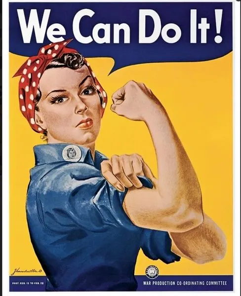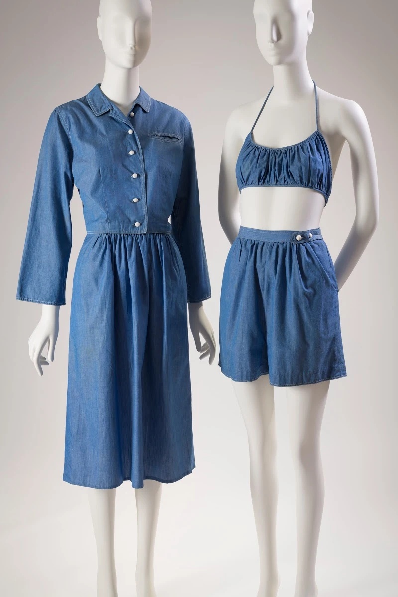 Rosie Riveter 프로파간다 포스터(좌측), 1940년대 여성 작업복(중심), 데님 소재의 여성용 피서복(우측)