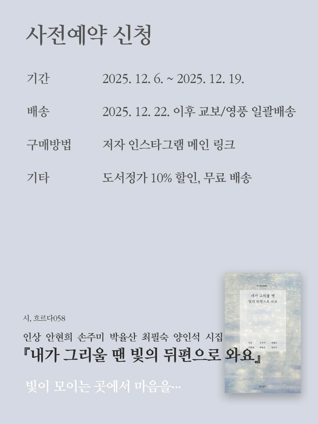 떨리는 마음으로 저의 첫 공저 시집에 대한 사전 예약 판매 홍보를 시작합니다.