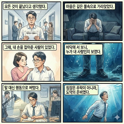 아내를 출근시키고 수영을 다니고 공부를 하며 억지로 몸을 움직였지만, 마음은 이미 깊은 물속으로 가라앉아 있었습니다.
