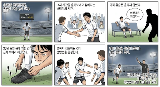 땀을 식히며 후반전의 전략을 짜고, 흐트러진 전열을 재정비하는 치열한 작전 타임입니다.
