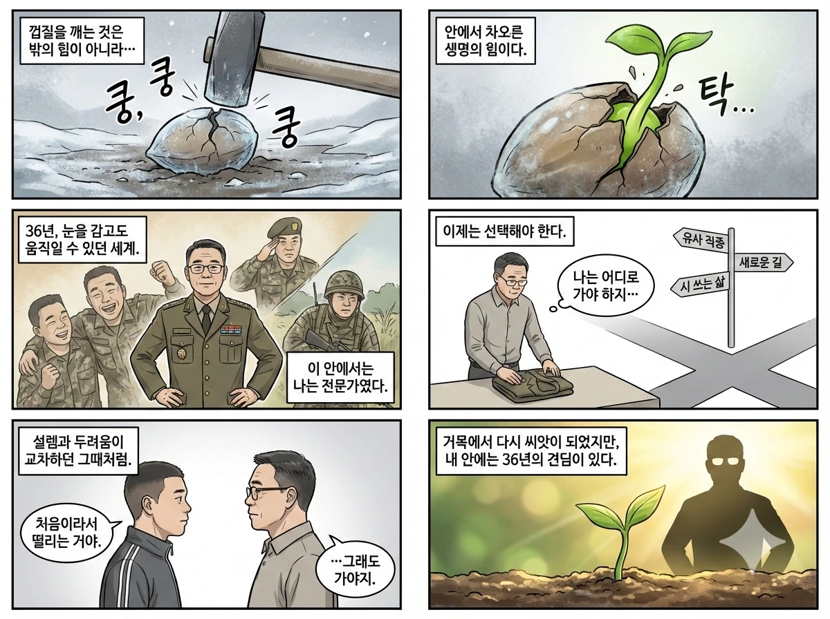 다 자란 나무의 자리를 내려놓고 다시 작은 씨앗이 되었지만, 제 안에는 36년간 켜켜이 쌓아온 '견뎌내는 힘'이 있으니까요.