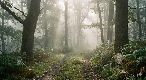 안개 자욱한 숲 속을 조용히 걷는다.