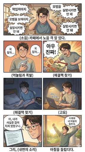 흐트러진 모습이나 엇나간 생각은 절대 용납할 수 없다는 듯, 제 안에서 일어나는 불편한 감정들을 억지로 삼키고 숨기기에 급급했습니다.