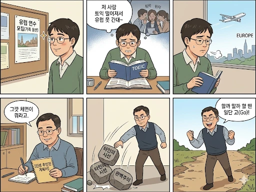 '간다고 큰소리쳤다가 토익 점수가 안 나와서 떨어지면 얼마나 창피할까' 하는 바보 같은 두려움이 제 발목을 꽉 잡았던 것입니다.